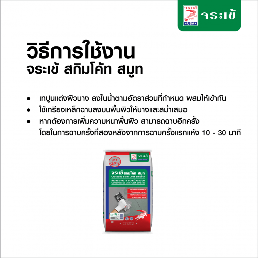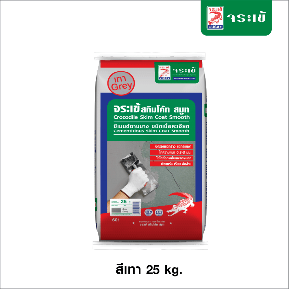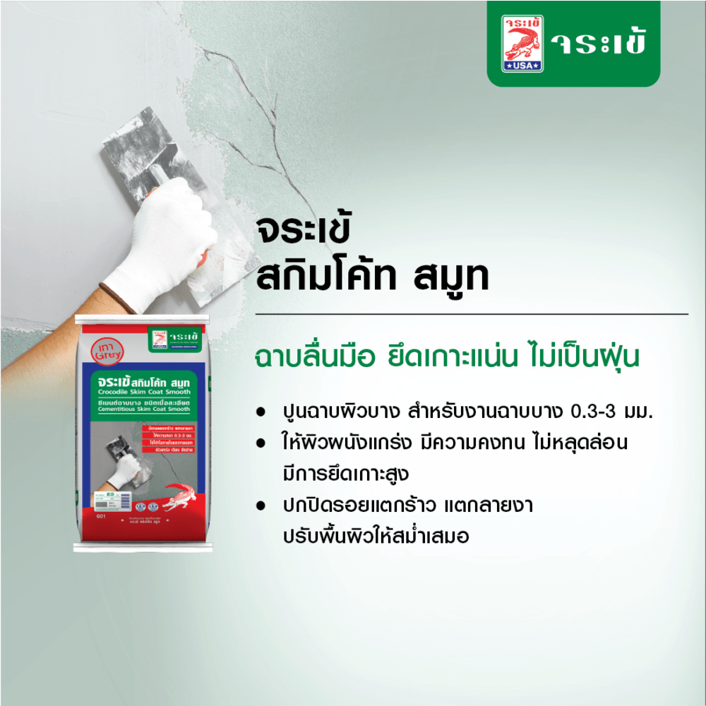 จระเข้ สกิมโค้ท สมูท ซีเมนต์แต่งผิวบาง ชนิดเนื้อละเอียด เป็นซีเมนต์ฉาบตกแต่งพื้นผิว ใช้สำหรับปกปิดรอยแตก รอยแยก ให้มีความเรียบเนียน คงทน ใช้งานได้ทั้งคอนกรีตมวลเบา อิฐบล็อค หรือ ผนังฉาบเรียบ สำหรับปกปิดรอยแตกบนผิวหน้าและปรับให้พื้นผิวงานสม่ำเสมอสามารถทนต่อสภาวะอากาศได้ดี ไม่ก่อให้เกิดรอยแตกร้าว สามารถใช้ได้กับงานตกแต่งทั้งภายนอกและภายในอาคาร ช่วยลดอัตราการใช้สีทาผนังได้กว่า 20% (กรณีใช้ผลิตภัณฑ์ที่เป็นสีขาว) ผลิตภัณฑ์นี้ได้รับการรับรองว่าไม่มีสารระเหย (Non VOC)
