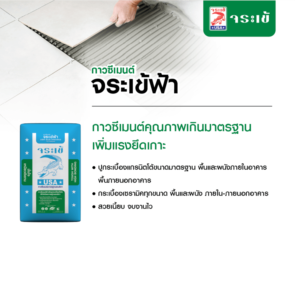 กาวซีเมนต์จระเข้ฟ้า ประกอบด้วยปูนซีเมนต์ปอร์ตแลนด์ ทรายละเอียดคัดพิเศษ และวัสดุผสมพิเศษอื่นๆ ทำให้ผลิตภัณฑ์มีคุณสมบัติที่ให้การยึดเกาะสูง กาวซีเมนต์ จระเข้ฟ้า ใช้สำหรับงานปูกระเบื้องเซรามิคทั่วไป ใช้ได้ทั้งพื้นและผนังภายในอาคาร โดยไม่ต้องแช่กระเบื้องก่อนปู