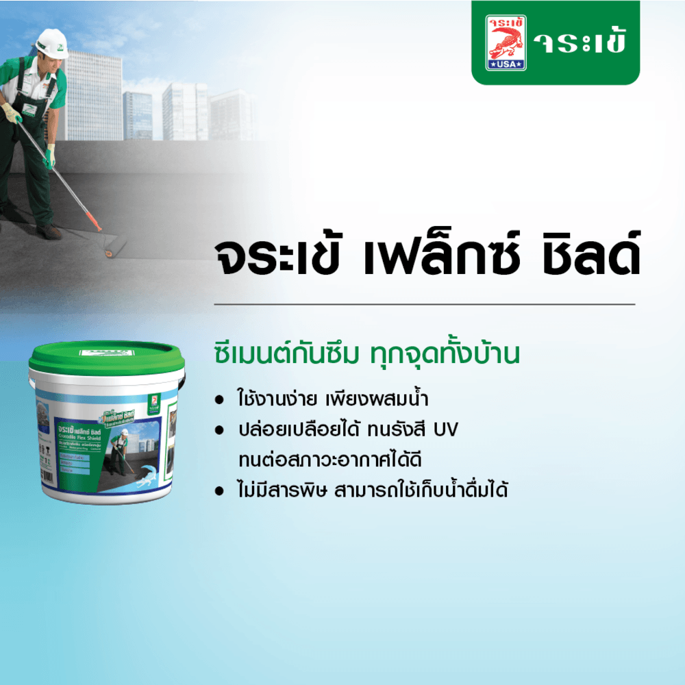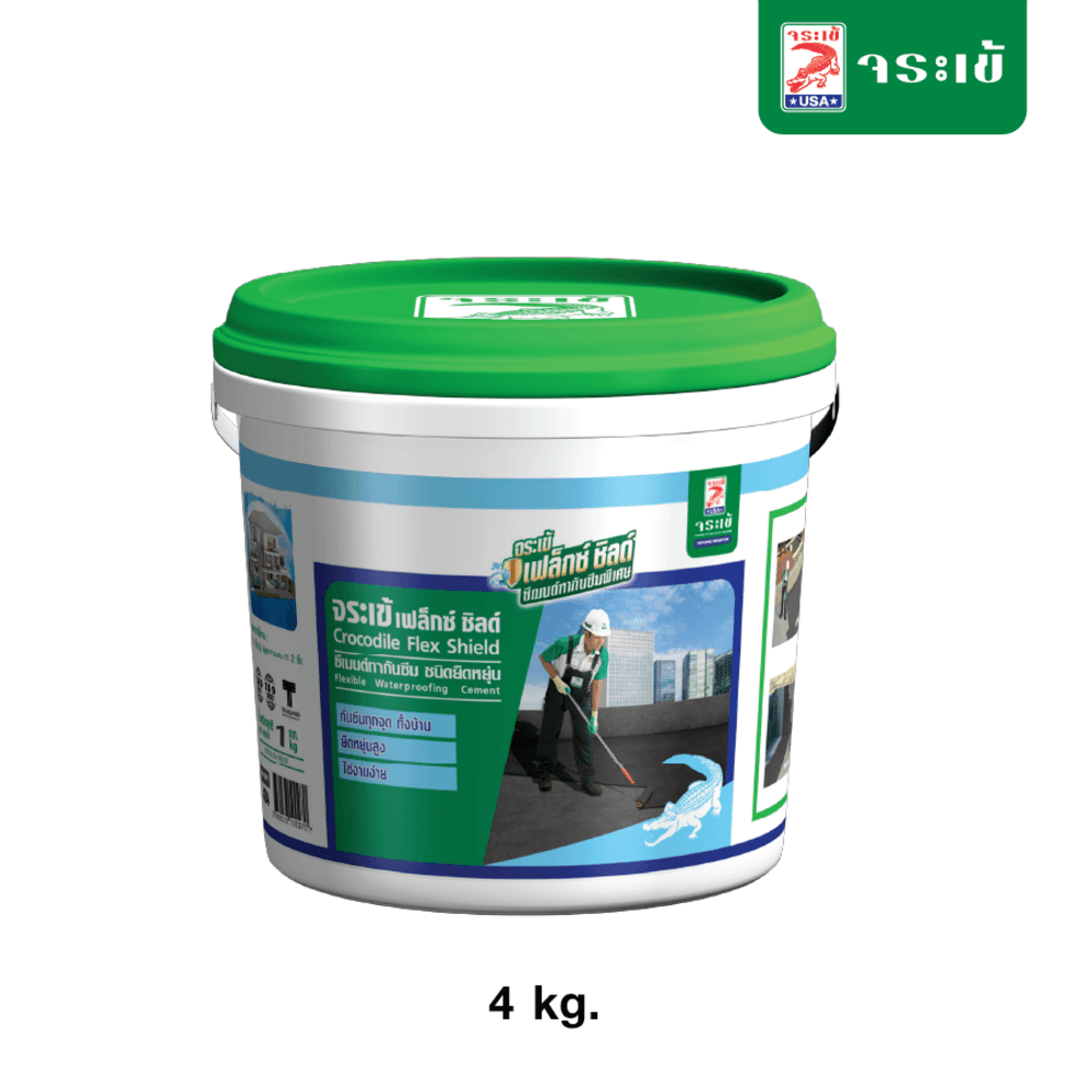 จระเข้ เฟล็กช์ ชิลด์ เป็นซีเมนต์ทากันซึมชนิดยืดหยุ่น แบบส่วนผสมเดียว ใช้งานง่ายเพียงผสมน้ำ ทนต่อสภาวะอากาศได้ดี ปล่อยเปลือยได้ ทนรังสี UV มีคุณสมบัติในการปิดรอยร้าวได้ดี สามารถใช้ในพื้นที่ที่มีโอกาส ขยับเคลื่อนไหว ผิวงานที่เสร็จแล้วมีความคงทน ไม่หลุดล่อน มีแรงยึดเกาะที่ดี ไม่มีสารพิษ