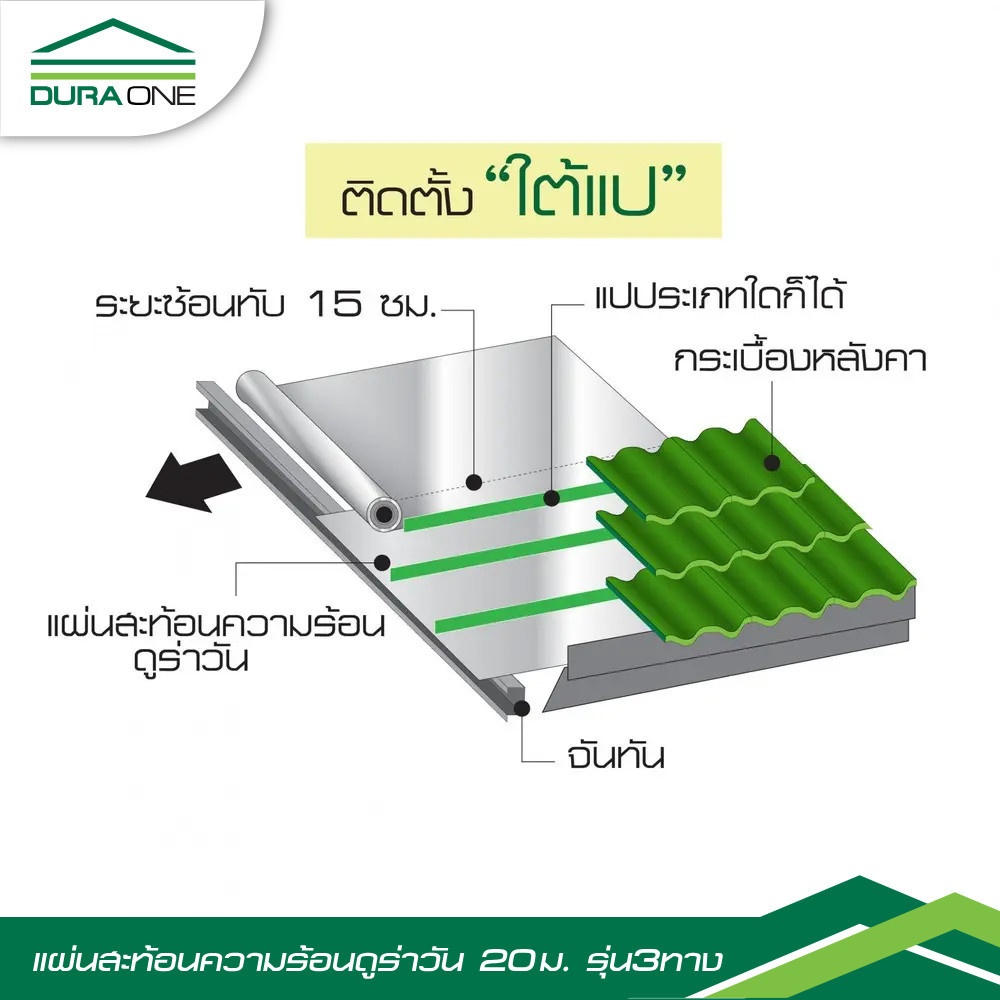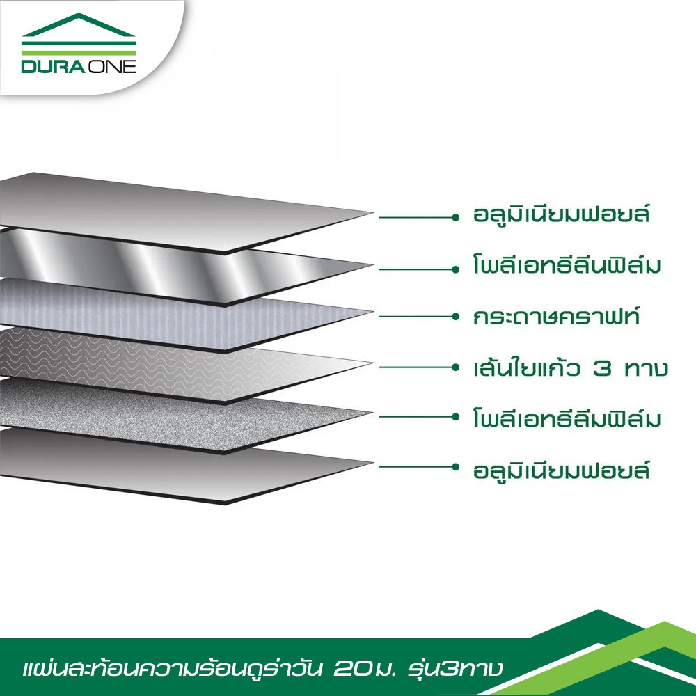 แผ่นสะท้อนความร้อนดูร่าวัน ป้องกันรังสีความร้อนเข้าสู่ตัวบ้าน แข็งแรงด้วยโครงสร้าง 6 ชั้น และเส้นใยแก้ว 3 ทาง สะท้อนรังสีความร้อนได้มากถึง 95% ไม่ลามไฟ ติดตั้งง่าย ใช้ได้กับหลังคาทุกชนิด