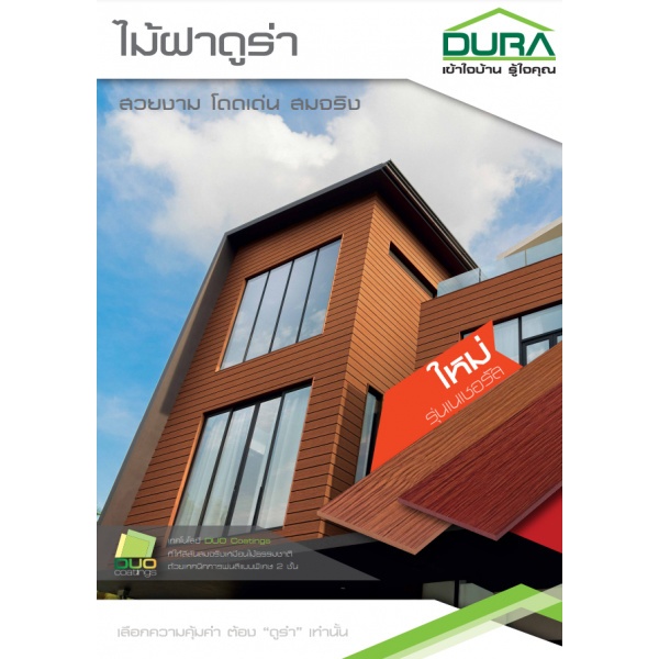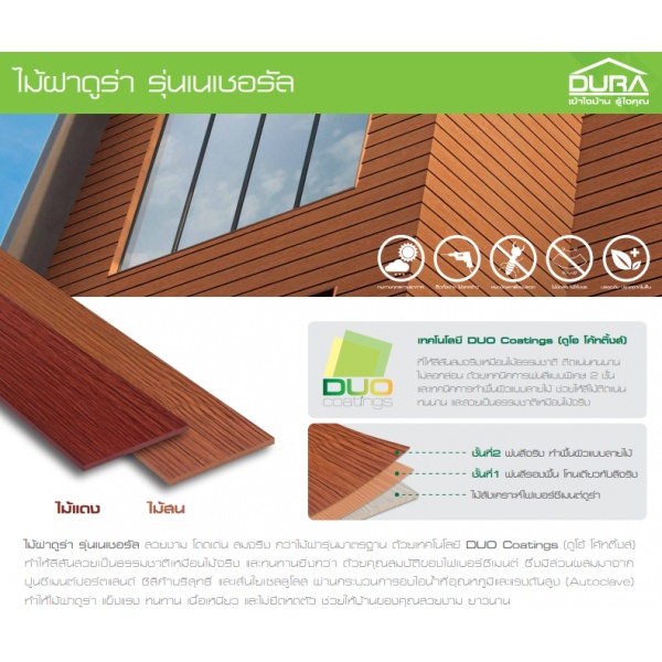 สวยงาม โดดเด่น สมจริง กว่าไม้ฝารุ่นมาตรฐาน ด้วยเทคโนโลยี DUO Coatings (ดูโอ้ โค้ทติ้งส์) ที่เคลือบสีถึง 2 ชั้น พร้อมเทคนิคการทำพื้นผิวแบบลายไม้ ช่วยให้สีไม้ติดแน่น ทนนาน ให้สีสันสวยเป็นธรรมชาติเหมือนไม้จริง