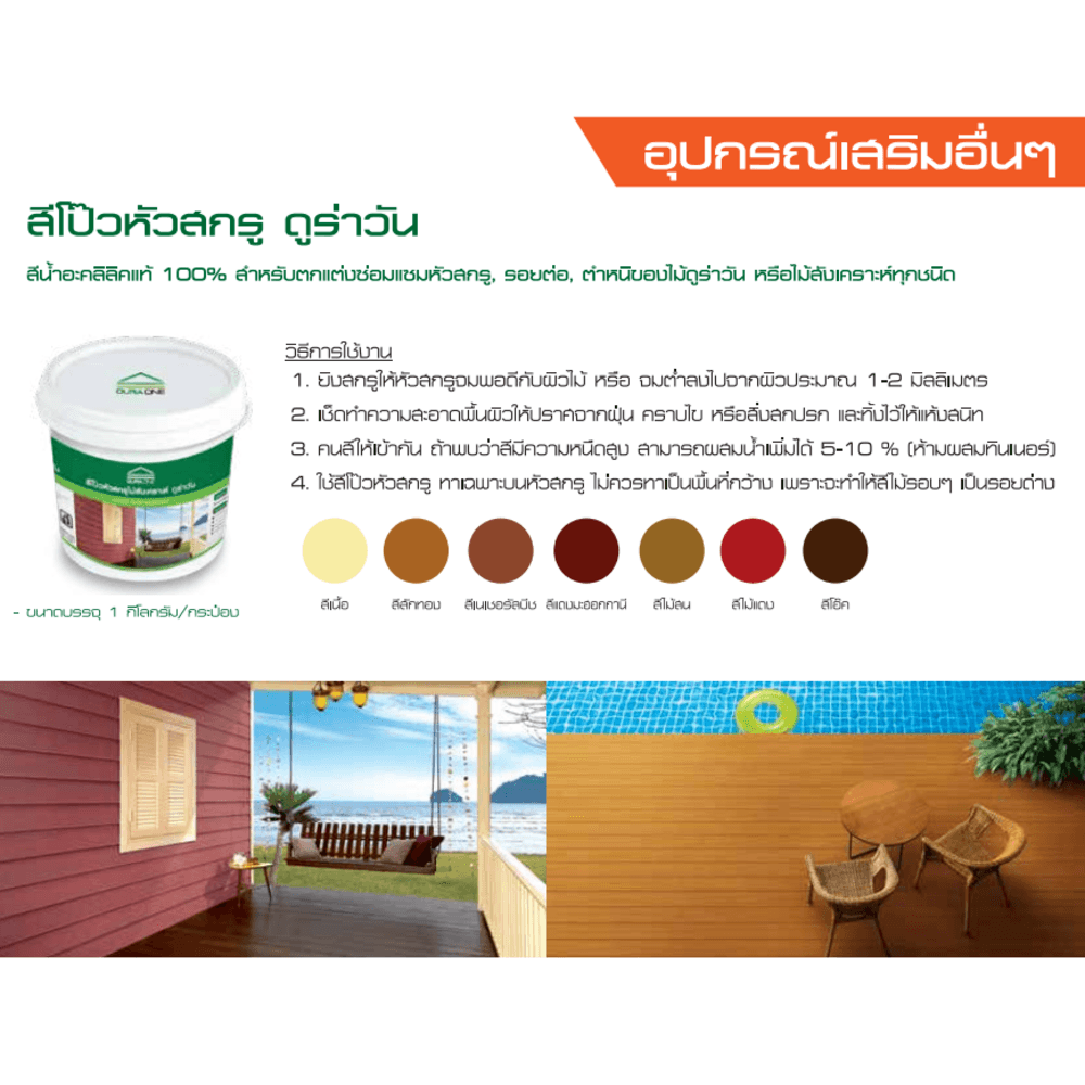 4.กรณีงานซ่อมแซม ควรทาสีเฉพาะบริเวณหัวตะปู รอยต่อแผ่นไม้ฝา หรือจุดที่ต้องการซ่อมแซม ไม่ควรทาบนพื้นที่กว้างตัวอย่างสี ให้เอาภาพจากไม้ฝามาใส่ ยกเว้น สีเนเชอรัลบีช ให้เอารูปจากไม้พื้น