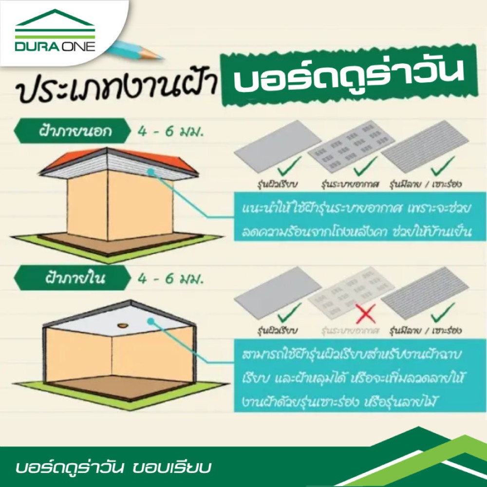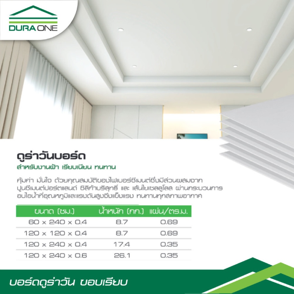 สำหรับงานฝ้า และงานผนัง เรียบเนียน ทนทานดูร่าวันบอร์ด บ้านเย็น คุ้มค่า มั่นใจ ด้วยคุณสมบัติของไฟเบอร์ซีเมนต์ซึ่งมีส่วนผสมมาจากปูนซีเมนต์ปอร์ตแลนด์ ซิลิก้าบริสุทธิ์ และ เส้นใยเซลลูโลส ผ่านกระบวนการอบไอน้ำที่อุณหภูมิและแรงดันสูงจึงแข็งแรง ทนทานทุกสภาพอากาศ