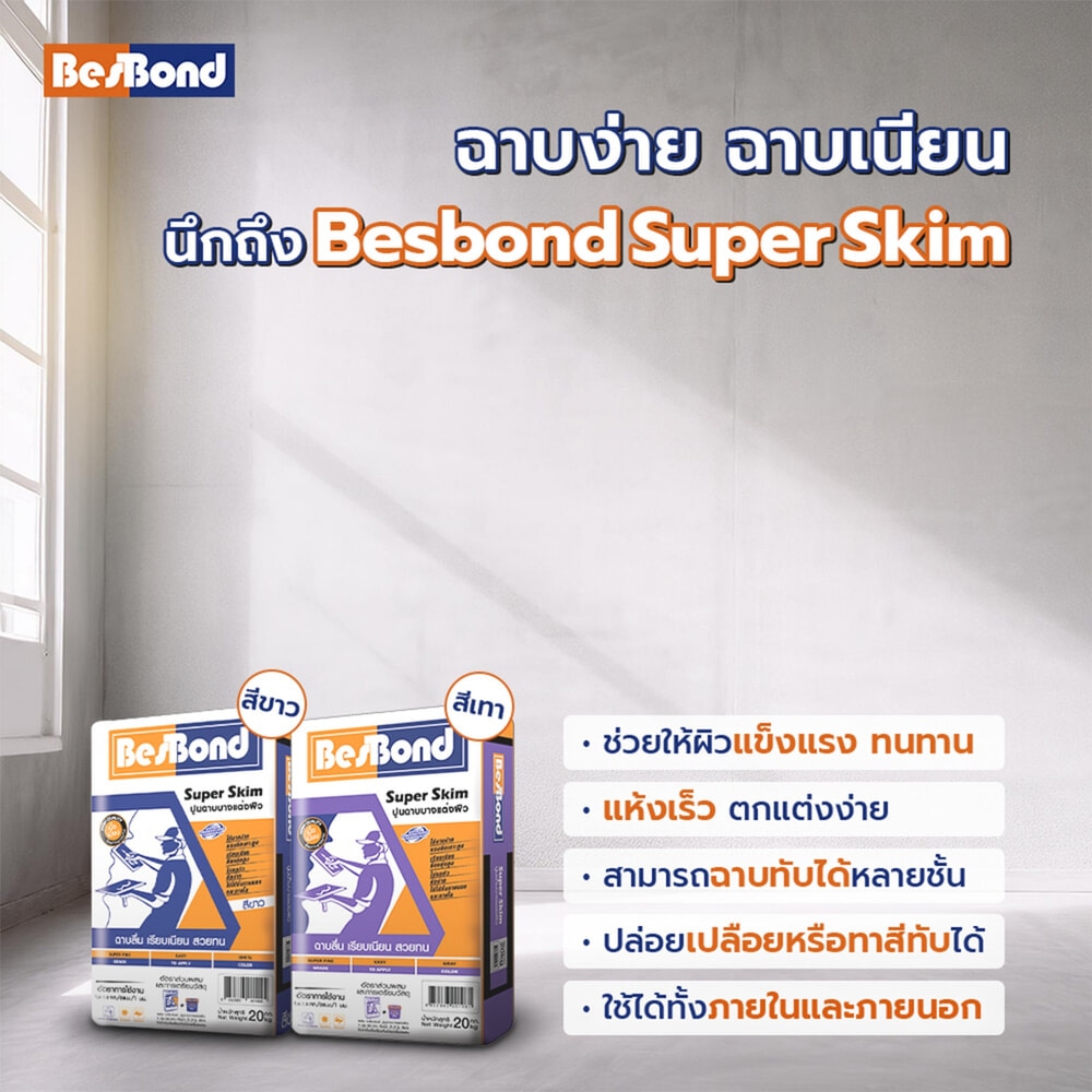 มีส่วนผสมของสารป้องกันราดำ แรงยึดเกาะดี ฉาบง่าย ลื่นมือ ให้ผิวเรียบ ไม่เป็นฝุ่น ให้การยึดเกาะกับพื้นผิวได้ดี ไม่หลุดล่อน แก้ไขข้อบกพร่องพื้นผิว เช่น รอยตามด รอยแตก ลายงา รอยเม็ดทราย แห้งเร็วขัดตกแต่งง่าย ทนทานต่อสภาวะอากาศ สามารถปล่อยเปลือยได้ ใช้งานได้ทั้งภายนอกภายใน