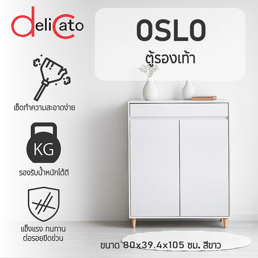 DELICATO ตู้รองเท้า รุ่นออสโล ขนาด 80x39.4x105 ซม. สีขาว ดีไซน์เรียบหรู ประหยัดพื้นที่ สำหรับจัดวางที่หน้าบ้าน ห้องเก็บของ หรือทางเดินภายในบ้าน จัดเก็บรองเท้าอย่างเป็นระเบียบ มีบานประตู 2 บาน ภายในมีชั้นวางหลายช่องรองเท้า ลิ้นชักด้านบน 1 ลิ้นชัก เก็บของเล็ก เช่น ถุงเท้า หรืออุปกรณ์ดูแลรองเท้า ใช้งานสะดวก บานพับแข็งแรง เปิด-ปิดนุ่มนวล วัสดุผลิตจากไม้ปิดผิวเมลามีนคุณภาพดี ไม่เป็นรอยง่าย มีความทนทานต่อการใช้งาน ผิวเรียบเนียน เช็ดทำความสะอาดง่าย ดีไซน์สวยงาม ให้เข้ากับสไตล์ของคุณ