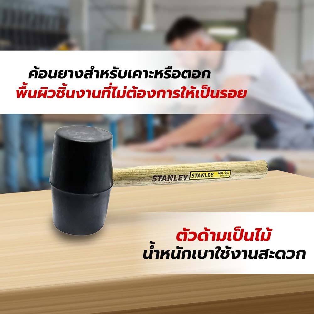 ค้อนยาง จากแบรนด์ STANLEY ผลิตจากยางเนื้อดีมีความนิ่มไม่แข็งกระด้าง สำหรับใช้งานตอก หรือเคาะบนส่วนของพื้นผิวที่ไม่ต้องการให้เป็นรอย และแตกบุบเสียหาย โดยด้ามไม้ออกแบบให้จับถือถนัดกระชับมือ ช่วยให้แรงเคาะได้มากขึ้น พร้อมลดแรงกระแทกกลับ