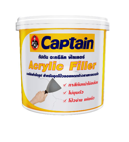 กัปตัน อะคริลิก ฟิลเลอร์สามารถใช้อุดโป๊วรอยแตกร้าวลายงา รูพรุนตามด สามารถขัดตกแต่งได้ง่ายมีการยึดเกาะได้ดีบนพื้นผิวปูน คอนกรีต เหมาะสำหรับใช้อุดโป๊วตกแต่งรอยแตกร้าวของผนังปูน หรือรอยต่อหัวตะปู ตะเข็บไม้ ใช้ได้ทั้งภายนอกและภายในอาคาร