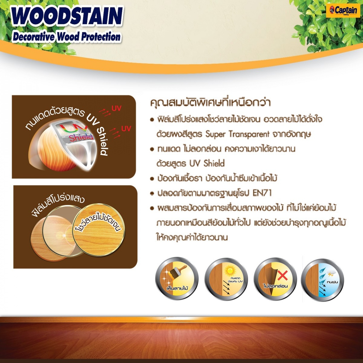 กัปตันวู๊ดสเตน ชนิดเงา เป็นสีย้อมและรักษาเนื้อไม้คุณภาพสูง เนื้อสีมาก โปร่งแสง โชว์ลายไม้ได้ชัดเจน