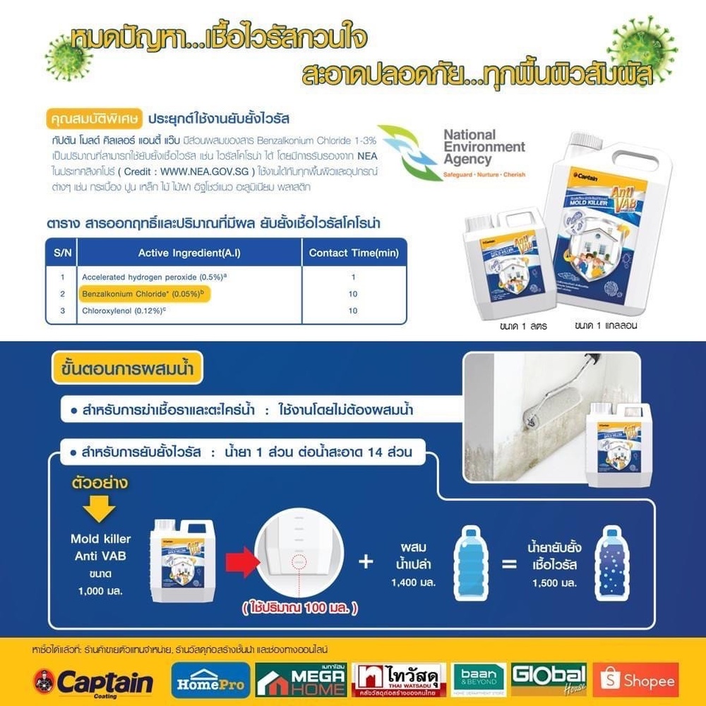 – บริเวณที่มีเชื้อราและตะไคร่น้ำมากให้ใช้แปรงพลาสติกขนแข็ง ขัดล้างออกให้หมดจากนั้นจึงทิ้งให้พื้นผิวแห้ง อย่างน้อย 24 ชั่วโมง และกลิ้งน้ำยาฆ่าเชื้อรากัปตัน จํานวน 1 เที่ยวให้ชุ่มๆ ทิ้งให้น้ำยาซึม ลงสู่พื้นผิวและปล่อยให้แห้งอย่างน้อย 24 ชั่วโมง โดยไม่ต้องล้างออกจากนั้นค่อยทาสีทับ