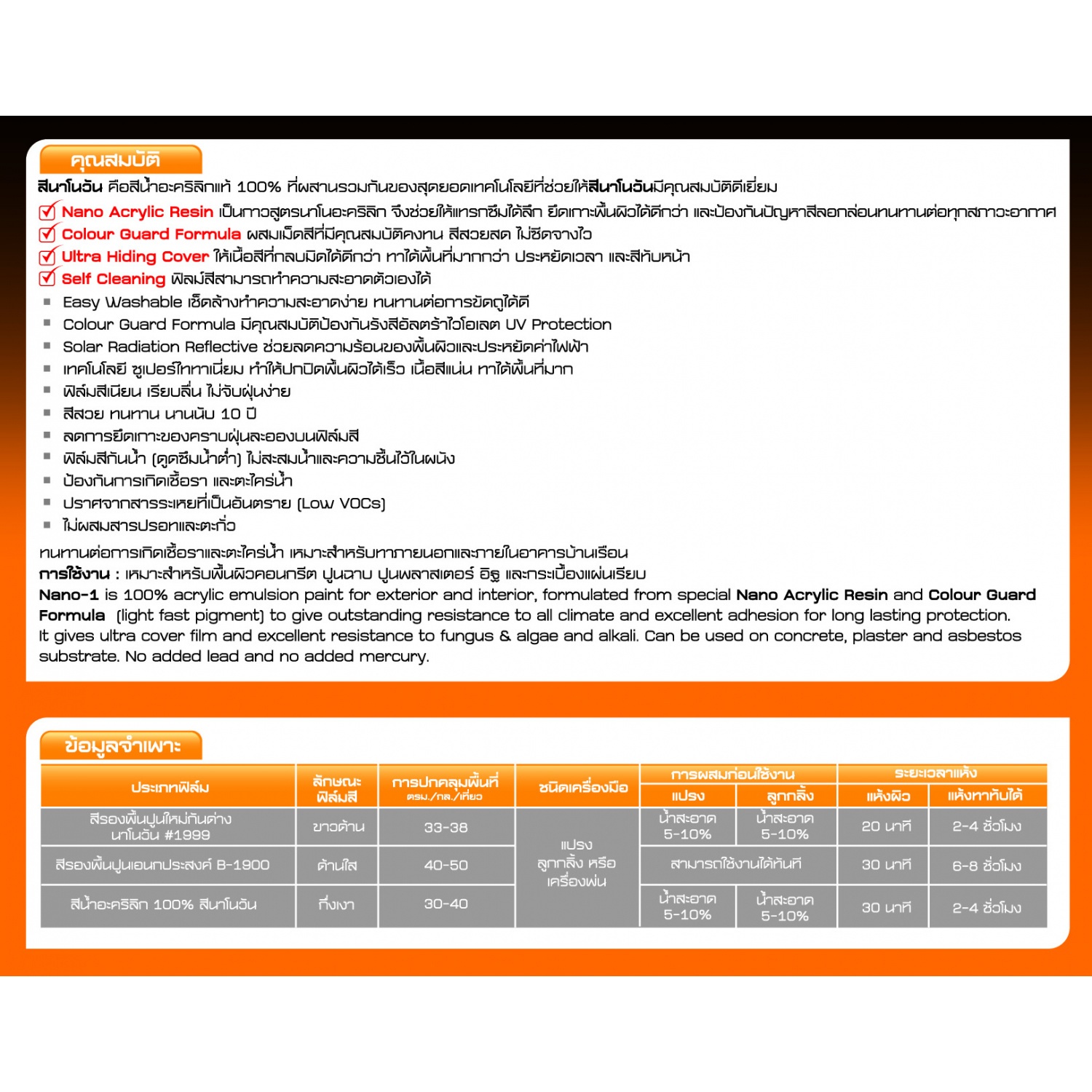 สีน้ำอะคริลิกแท้ 100% ที่มีส่วนผสมของกาวสูตรนาโนอะคริลิกที่สามารถแทรกซึมได้ลึก ยึดเกาะพื้นผิวที่ดีกว่าและป้องกันปัญหาสีลอกล่อน ทนทานต่อทุกสภาวะอากาศ สีสวยสดไม่ซีดจางไว กลับมิดได้ดีกว่า ทาได้พื้นที่มาก ประหยัดเวลาและสีทับหน้า ฟิล์มสีกึ่งเงา ใช้ได้ทั้งภายนอกและภายใน