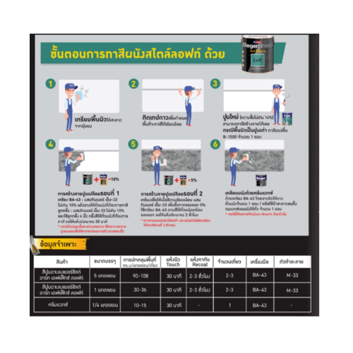 แล้วใช้ เกรียง BA-43 ฉาบให้ทั่วผนังที่ต้องการทาสี หรือ กรณีที่ต้องการประหยัดเวลา ผสมทินเนอร์ เอ็ม-33 ไม่เกิน 15% และใช้ลูกกลิ้ง 4 นิ้ว กลิ้งสีให้ทั่วผนังที่ต้องการทาสี รอให้แห้งประมาณ 30 นาที