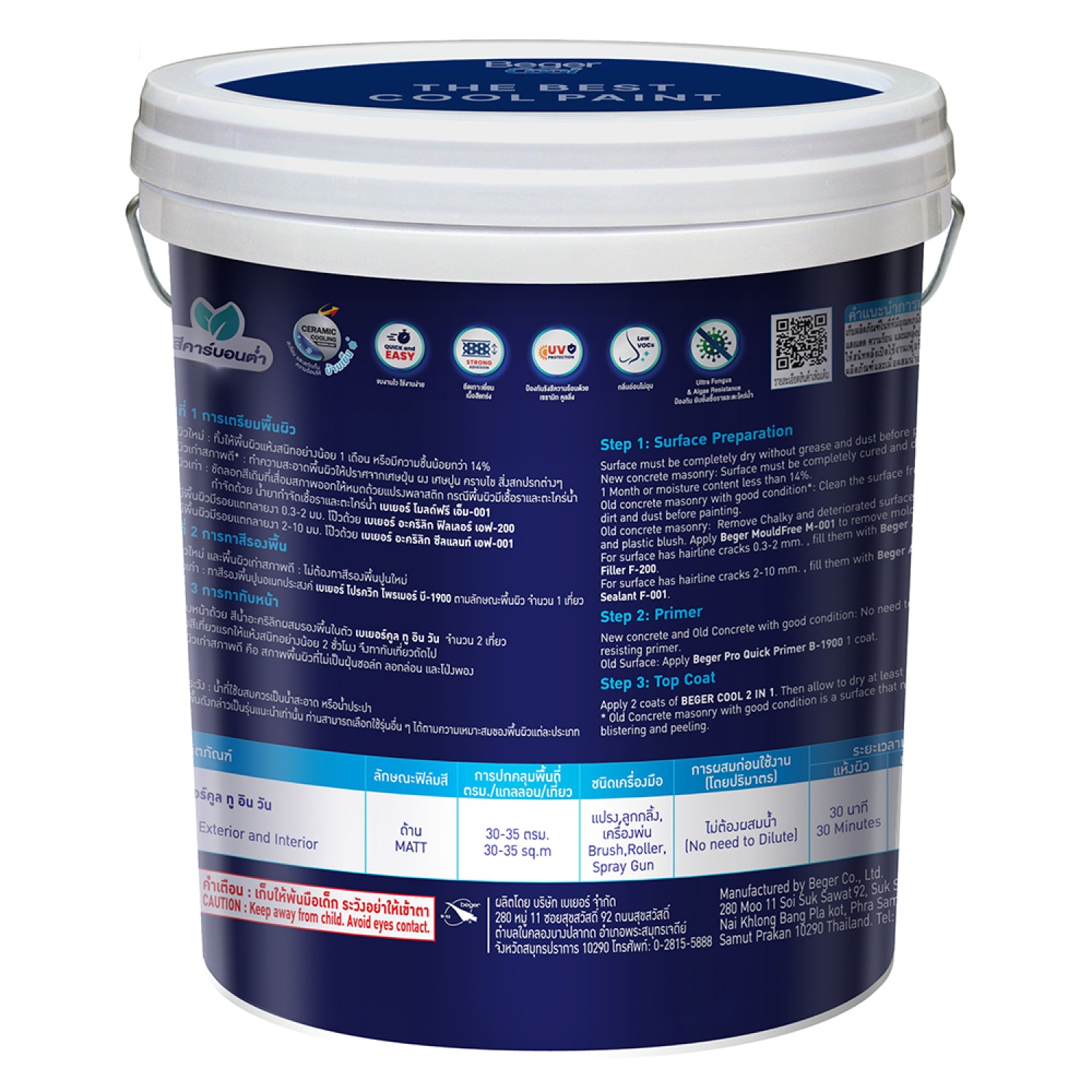 | รุ่น | Beger คูล 2อิน1 สีน้ำผสมรองพื้นในตัว ภายนอก ด้าน (CM100) 5GL สีขาว |