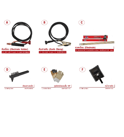 ชุดสายเชื่อมไฟฟ้า / ชุดสายดิน / หน้ากากถือ / แปรง+ค้อนเคาะสแล็ก / ถุงมือหนัง / กระเป๋า
