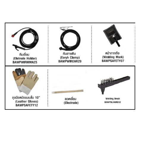 -เครื่องเชื่อม / ชุดสายเชื่อม / ชุดสายดิน /หน้ากากถือ / ค้อนเคาะสแล็ก / ถุงมือหนังแบบสั้น 10"