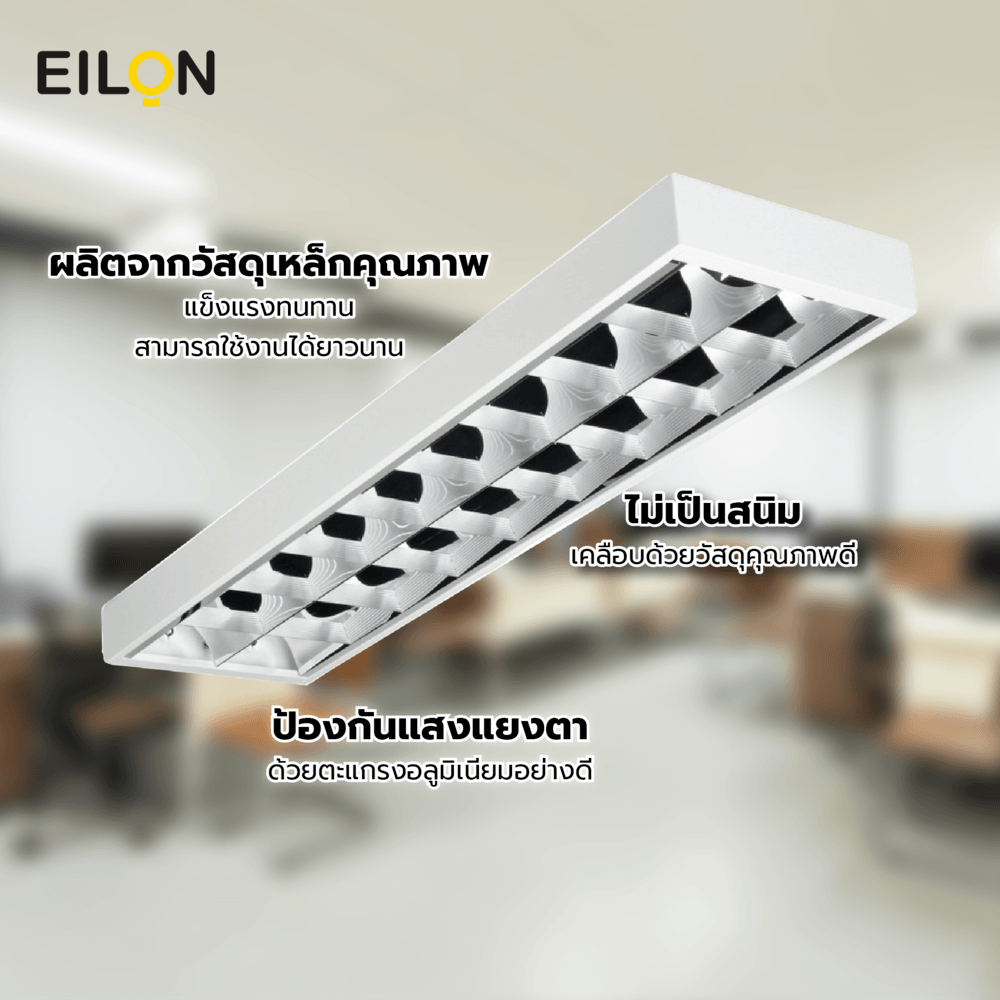 โคมไฟตะแกรงแบบติดลอย ใช้สำหรับติดตั้งหลอดไฟขั้วรับหลอดชนิด T8 จำนวน 2 หลอด แบบหลอดยาว ติดตั้งแบบติดลอย ผลิตจากวัสดุเหล็กคุณภาพ แข็งแรงทนทาน สามารถใช้งานได้ยาวนาน รับประกัน 2 ปี สามารถใช้ได้กับหลอดฟลูออเรสเซนต์แอลอีดี เหมาะสำหรับติดตั้งภายในอาคารที่ต้องการความสว่างสูง อาทิเช่น สำนักงาน, ห้างสรรพสินค้า, หรือหน่วยงานราชการ ต่างๆ เช่น โรงพยาบาล, สถานศึกษา, เทศบาล เป็นต้น ตัวสินค้าสามารถกันน้ำIP20