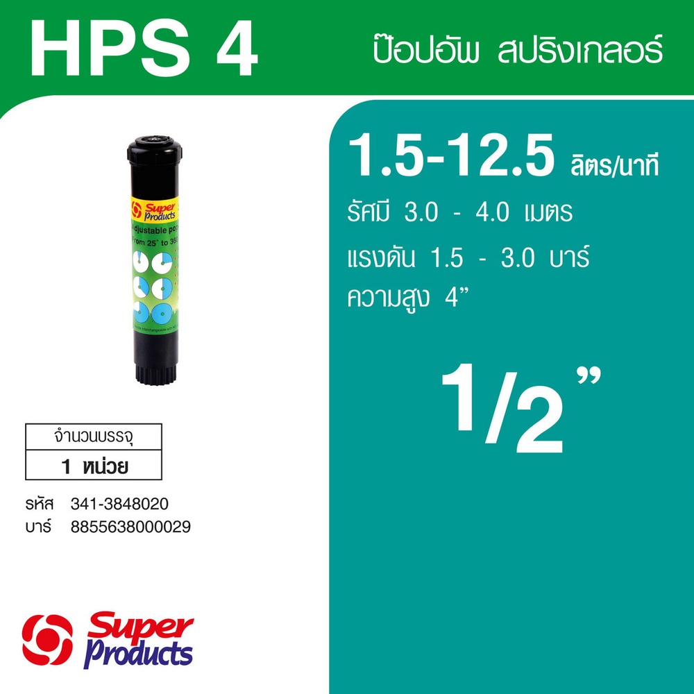 ความสูง 4นิ้ว ขนาดเกลียว1/2นิ้ว รัศมี3.0-4.0เมตร ปริมาณน้ำ1.5-12.5 ลิตร/นาที