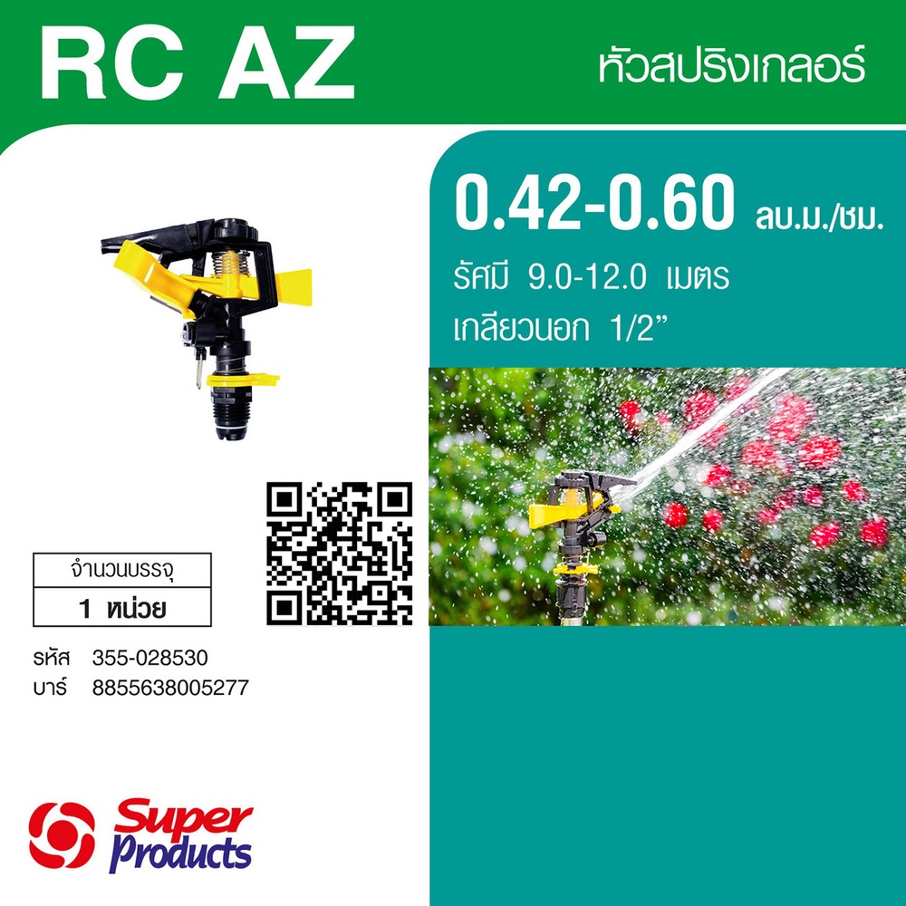 Super Products RC-AZ สปริงเกลอร์พลาสติก ปรับองศา-รัศมีได้ 1/2 นิ้ว Size ขนาดหัวฉีด (มม.)3.0 แรงดัน (บาร์)2 - 4 ปริมาณน้ำ (ลบ.ม./ชม.)0.42 - 0.60