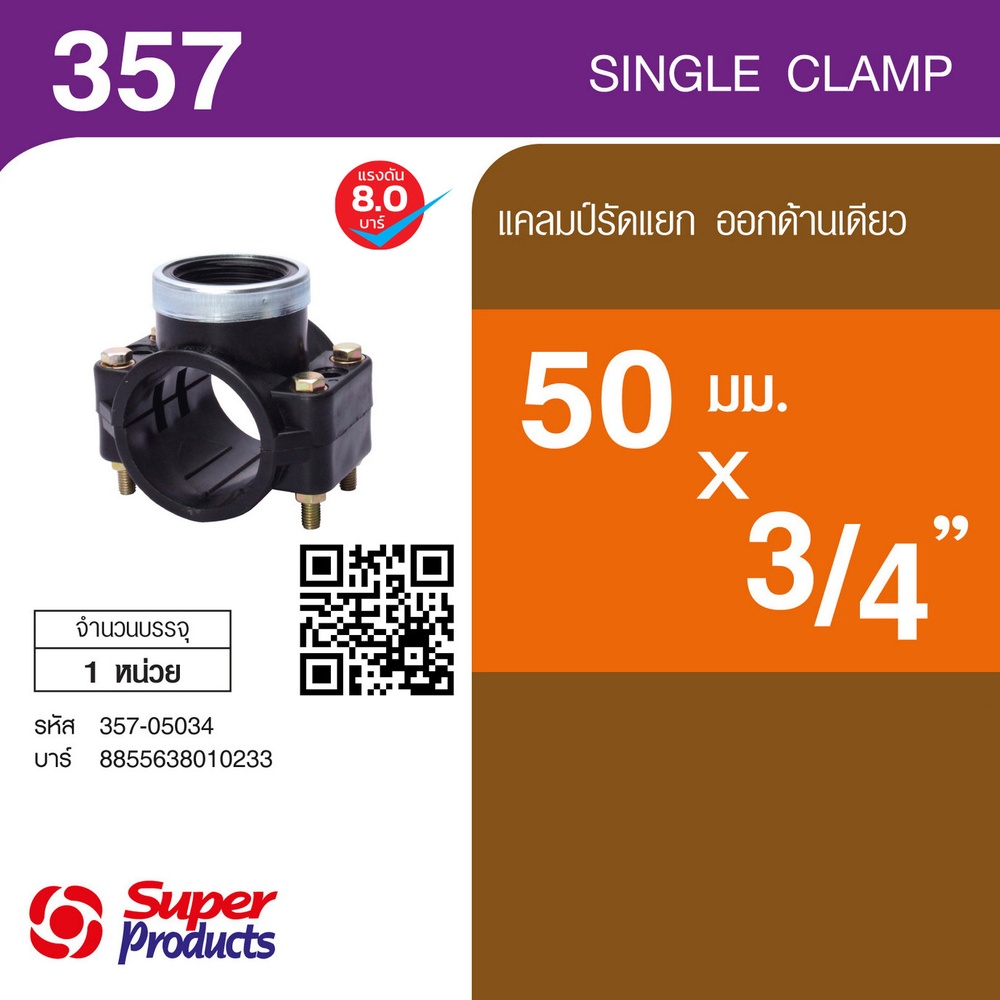 แคลมป์รัดแยก 50มม.x 3/4นิ้ว(305))ด้านเดียว• แรงดันสูงสุด : 8 บาร์ • มีแหวนเหล็กรัดบริเวณรอบเกลียวเพื่อเพิ่ มความแข็งแรงของเกลียวในการใช้งาน แคลมป์รัดแยก (Saddle Clamp) ใช้สําหรับแยกท่อแขนงออกจากท่อประธานหรือท่อรองประธาน การใช้แคลมป์รัดแยกมีข้อดีกว่าการใช้ข้อต่อสามทาง ดังนี้ • ไม่จําเป็นต้องตัดต่อท่อ • โอกาสเกิดการรั่วซึมน้อยกว่า • สูญเสียแรงดันน้อยกว่า • การติดตั้งง่ายกว่า • สามารถต่อแยกออก 2 ฝั่งได้ (ในกรณีใช้แคลมป์รัดแยกออกสองทาง) ในขณะท่ีข้อต่อสามทางแยกออกได้ฝั่งเดียว