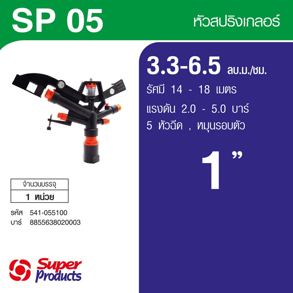 Super Products SP-05 สปริงเกลอร์ 1 นิ้ว - 5 หัวฉีด รุ่นสินค้า SP 05 รหัสสินค้า 541-055100 ขนาดเกลียว 1นิ้ว จํานวนหัวฉีด 5หัว แรงดัน 2-5บาร์ ปริมาณนํ้า (ลบ.ม./ชม.)