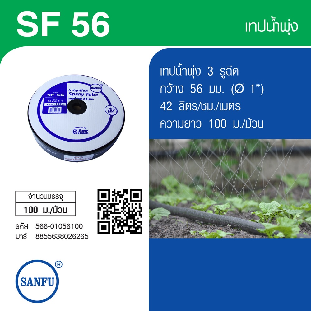 เหมาะสำหรับการให้น้ำพืชที่ปลูกเป็นแถว และต้องการปริมาณน้ำอย่างสม่ำเสมอ SF 56 566-01056100 3 รูฉีด , กว้าง 56 มม. 42 ลิตร/ชม./เมตร