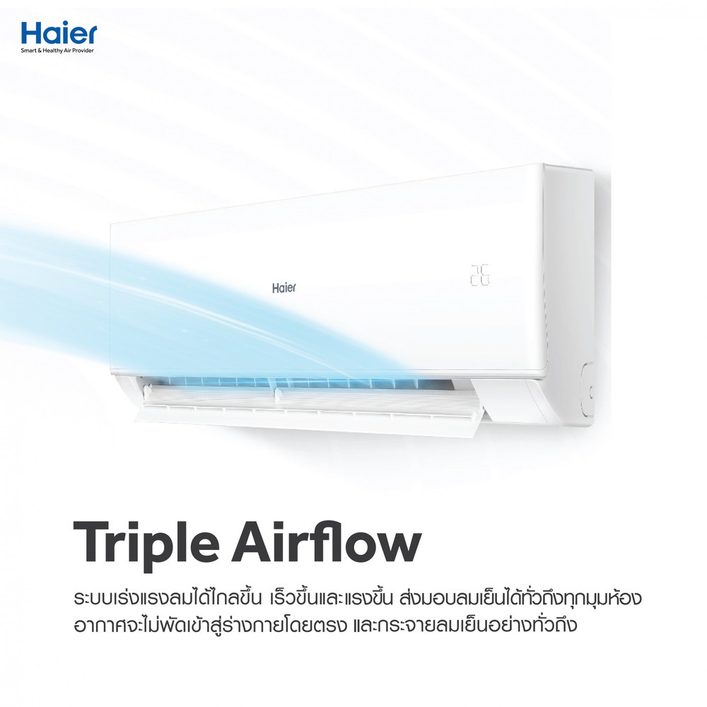 2. Triple Airflow ระบบเร่งแรงลมได้ไกลขึ้น เร็วขึ้นและแรงขึ้นเพื่อส่งมอบลมเย็นได้ทั่วถึงทุกมุมห้องสะดวกสบายมากขึ้น อากาศจะไม่พัดเข้าสู่ร่างกายโดยตรงและกระจายลมเย็นอย่างทั่วถึงอีกทั้งการไหลเวียนของอากาศแบบรวมศูนย์ไกลยิ่งขึ้นและเร็วกว่าอุณหภูมิที่ตั้งไว้
