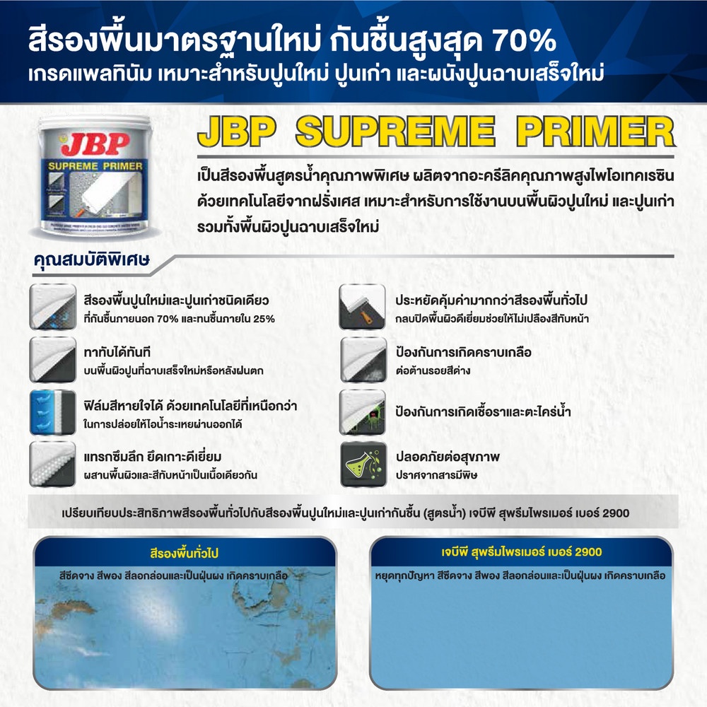 สีรองพื้นปูนใหม่และปูนเก่าชนิดเดียว ทาทับได้ทันที ฟิล์มสีหายใจได้ ด้วยเทคโนโลยีที่เหนือกว่า แทรกซึมลึก ยึดเกาะดีเยี่ยม ประหยัดคุ้มค่ามากกว่าสีรองพื้นทั่วไป ป้องกันการเกิดคราบเกลือ