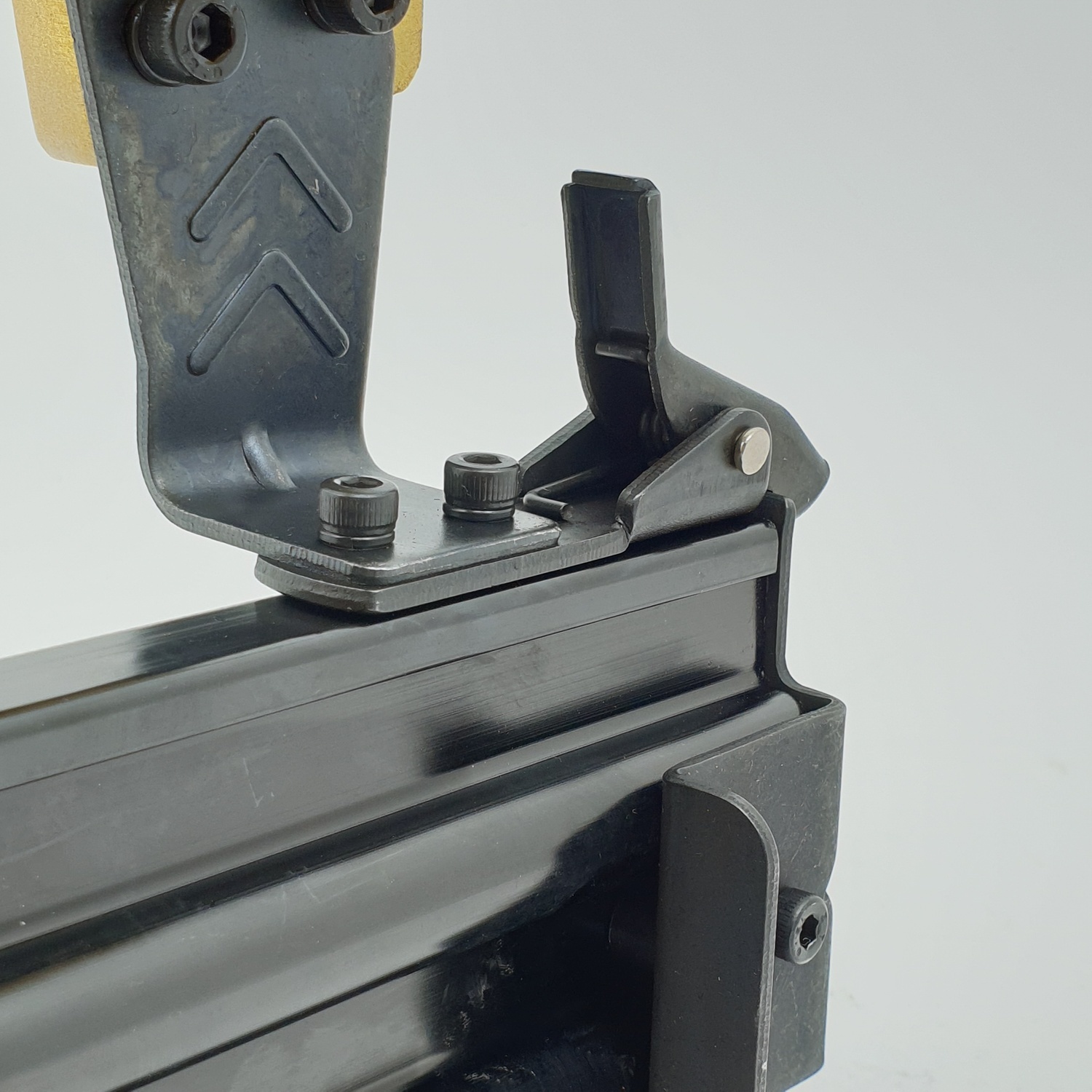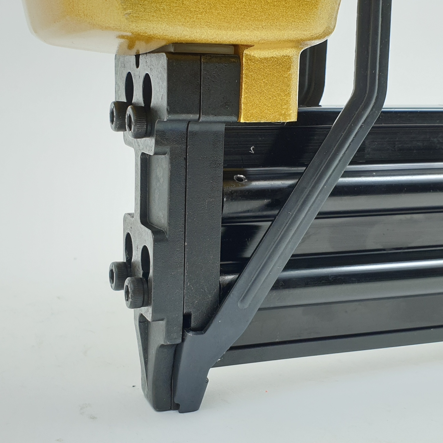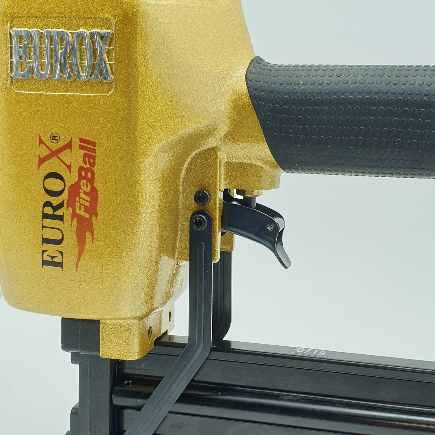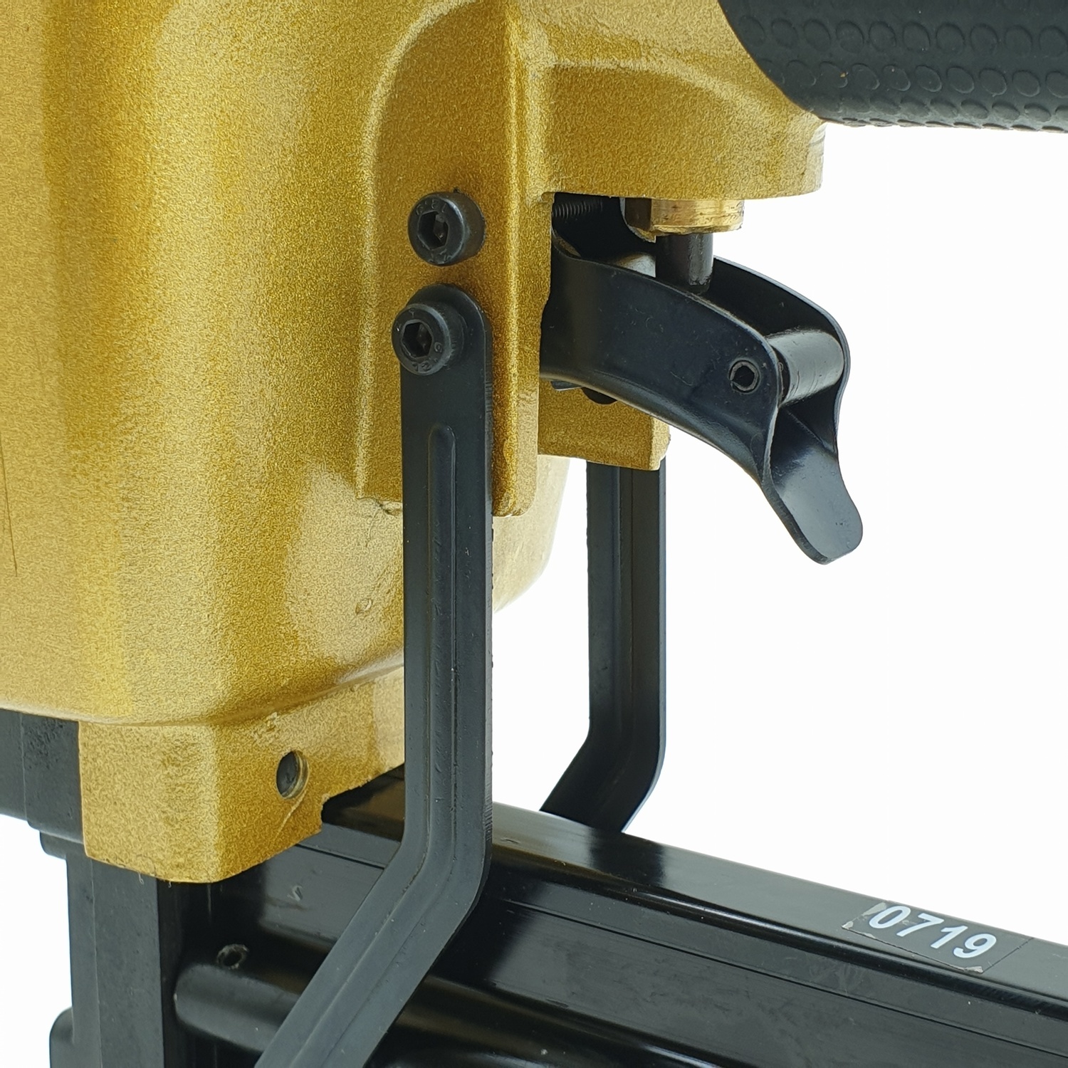 - ที่ปากปืนลมจะมีระบบหัวเซฟตี้ ป้องกันการยิงออกโดยไม่ได้ตั้งใจ ถ้าไม่ได้แนบลงบนชิ้นงานจะยิงลูกไม่ออก เมื่อแนบปลายปืนลมลงบนชิ้นงาน ชิ้นงานจะกดที่กระเดื่องปลายกระบอกปืนลมทำให้ปืนลมพร้อมยิงลูกออกได้