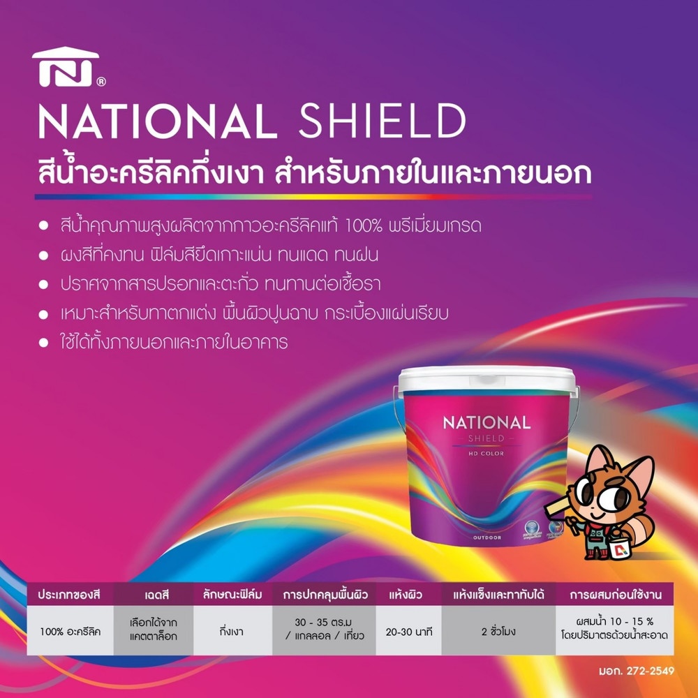 สีน้ำอะครีลิค 100% ชนิดกึ่งเงากึ่งด้านสำหรับภายนอกและภายใน เป็นสีมีคุณภาพและมีประสิทธิภาพที่ปกป้องคุ้มครองอาคารได้อย่างดี มีความทนทานสูงปกป้องพื้นผิวบ้านและอาคารจากมลภาวะตลอดจนการกัดกร่อน มีประสิทธิภาพในการยึดเกาะบ้านและอาคารสูงสีไม่ซีดจางมีสาร UV Protection ให้สีสวยทนนานด้วยเทคโนโลยี Salf Cleaning ที่มีคุณสมบัติต่อต้านการเกาะตัวของฝุ่นผง สิ่งสกปรก ทำให้ไม่ว่าจะผ่านที่สภาวะ National Shield ก็ให้สีสวยทนนานไปอีกนาน