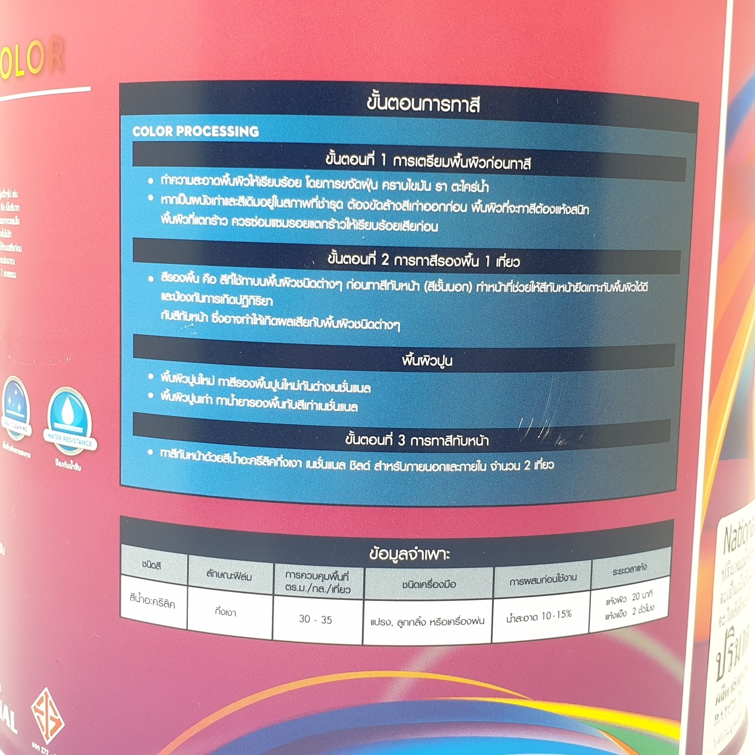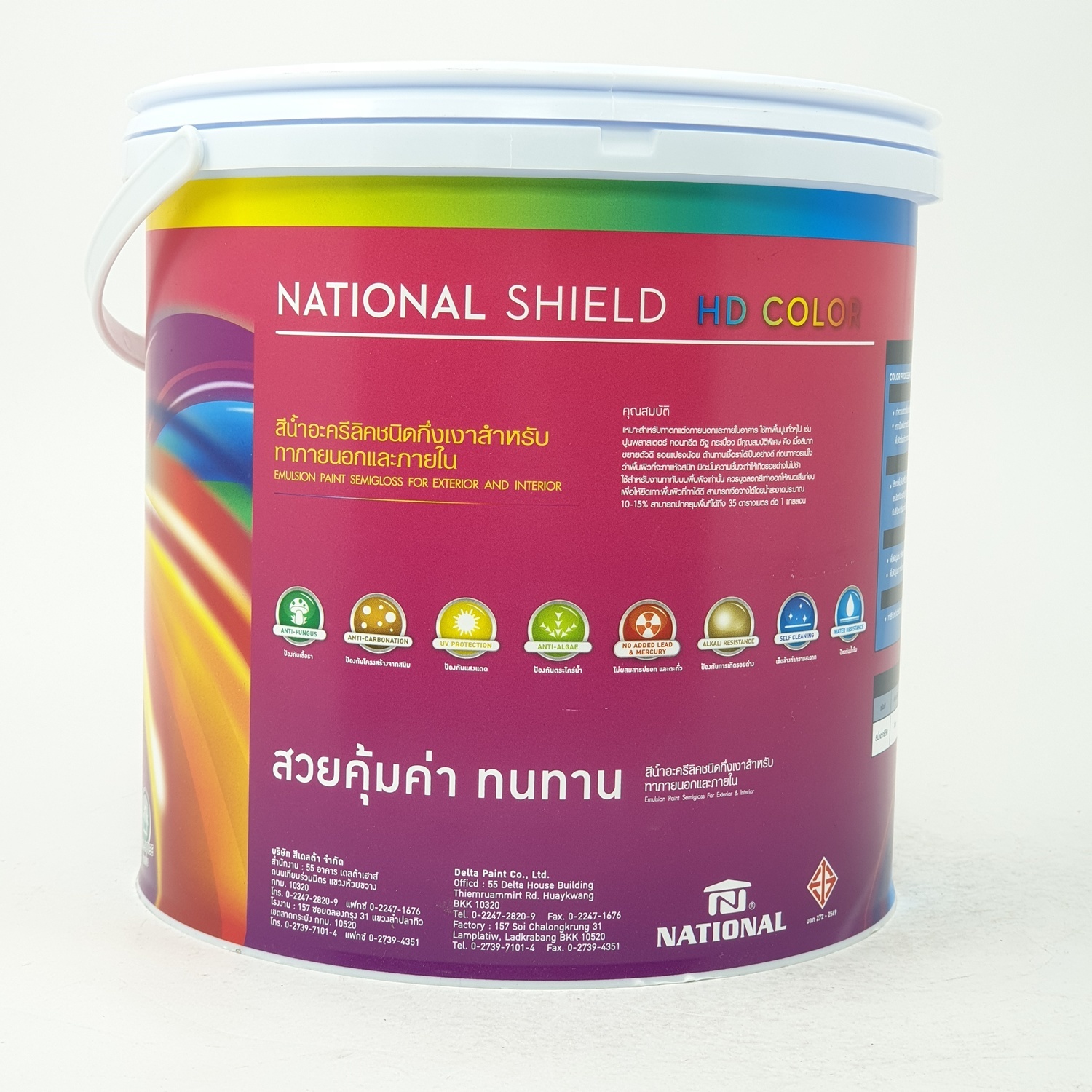สีน้ำอะครีลิค 100% ชนิดกึ่งเงากึ่งด้านสำหรับภายนอกและภายใน เป็นสีมีคุณภาพและมีประสิทธิภาพที่ปกป้องคุ้มครองอาคารได้อย่างดี มีความทนทานสูงปกป้องพื้นผิวบ้านและอาคารจากมลภาวะตลอดจนการกัดกร่อน มีประสิทธิภาพในการยึดเกาะบ้านและอาคารสูงสีไม่ซีดจางมีสาร UV Protection ให้สีสวยทนนานด้วยเทคโนโลยี Salf Cleaning ที่มีคุณสมบัติต่อต้านการเกาะตัวของฝุ่นผง สิ่งสกปรก ทำให้ไม่ว่าจะผ่านที่สภาวะ National Shield ก็ให้สีสวยทนนานไปอีกนาน