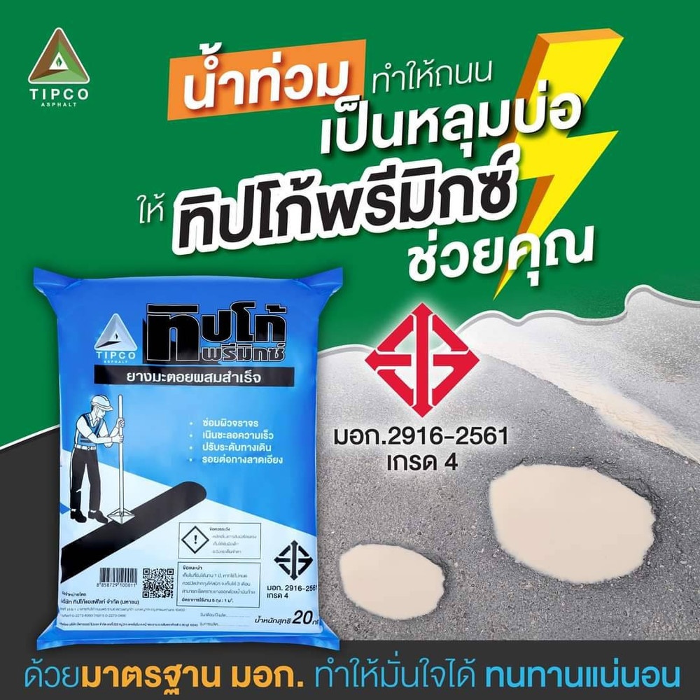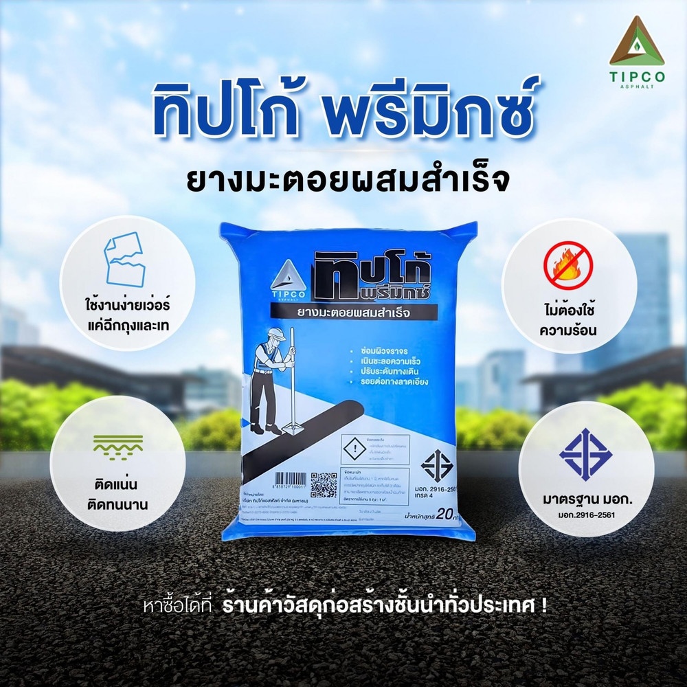 TIPCO PREMIX คือ วัสดุมวลรวมผสมชนิดเย็นด้วยยางแอสฟัลต์อิมัลชันแบบผสมเสร็จหรือวัสดุผสมเย็นสำเร็จรูปหรือที่เราเรียกว่า ยางมะตอยผสมเสร็จ ได้จาการผสมกันอย่างพอเหมาะระหว่างวัสดุมวลรวม (Aggregate) และยางแอสฟัลต์อิมัลชัน CMS-2 โดยที่ขบวนการผสมดำเนินไปในอุณหภูมิและบรรยากาศแบบปกติ แน่นทนนาน หินคัดเกรดไม่ยุบตัวง่ายและไม่ดูดซับยาง