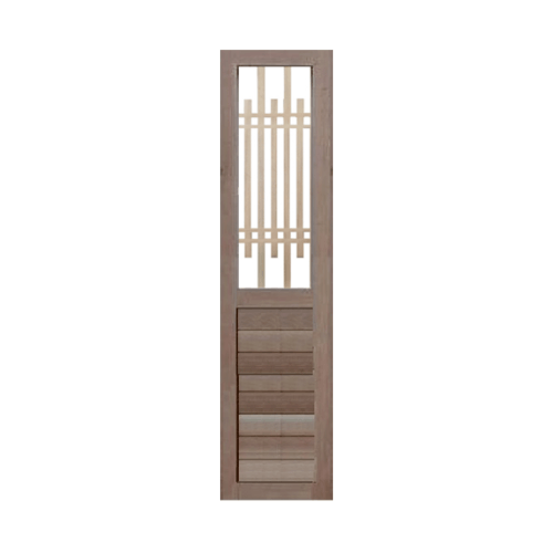 ประตูไม้สยาแดงอบแห้งเน้นความเรียบง่ายในความชื้นสัมผัส 12-15% เพื่อลดปัญหาไม้หด บวม หรือ โก่งงอ มีเนื้อไม้โทนสีน้ำตาลแดง ลายเสี้ยนที่หยาบและเงาเป็นธรรมชาติ มีความแข็งแรง คงทน ใช้งานได้ทั้งภายในและภายนอก และประกอบเข้าเดือยด้วยระบบเดือยเต็มซึ่งเป็นวิธีต่อไม้เพื่องานที่ต้องการความเข็งแรง และได้มาตรฐานมากที่สุด พร้อมทั้งยังใช้กาว E0 ซึ่งปราศจากสารก่อมะเร็งในการช่วยยึดติด และตอกตะปูเพื่อเพิ่มความแข็งแรง