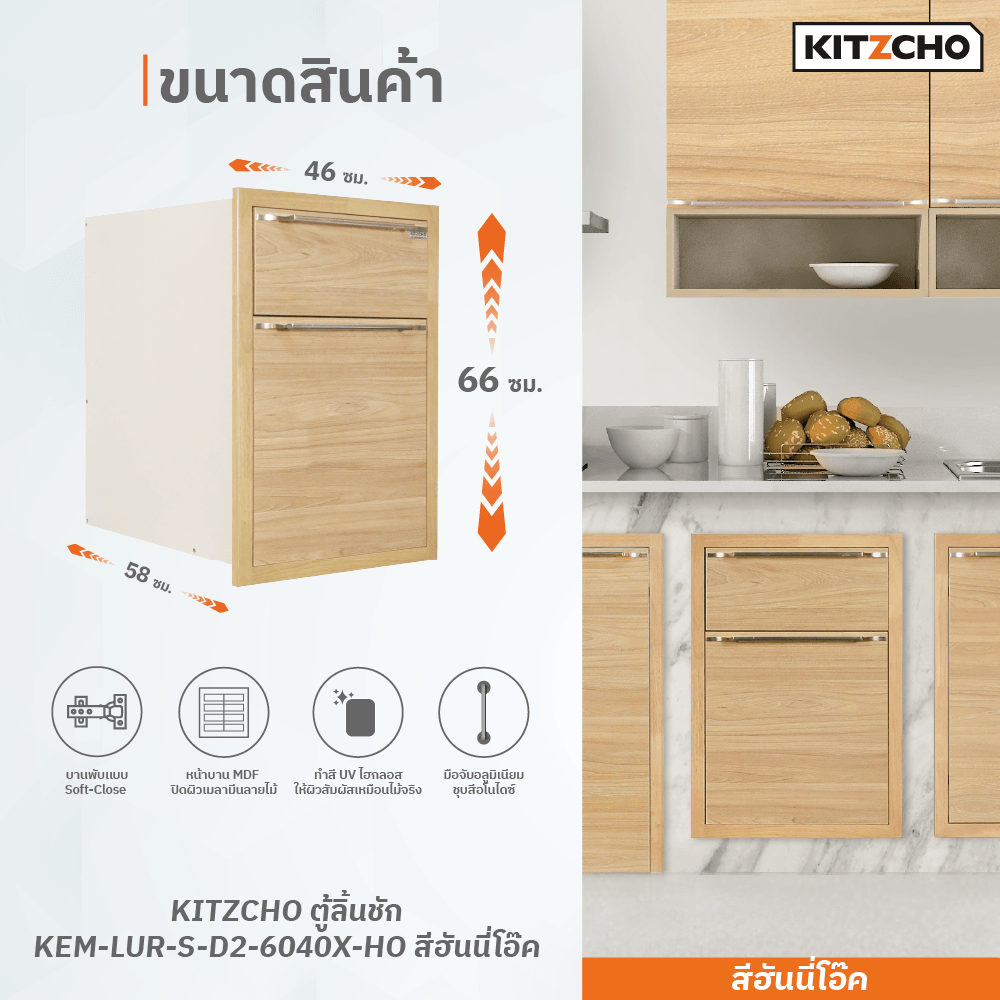 𝐋𝐔𝐂𝐈𝐃𝐀 ตู้ลิ้นชัก KITZCHO รุ่น KEM-LUR-S-D2-6040X-HO ขนาด 46 x 58 x 66 ซม. สีฮันนี่โอ๊ก ตอบรับรูปแบบชีวิตที่ทันสมัยด้วยชุดครัวโมเดิร์นสไตล์คลาสิค ผสมผสานความงามของธรรมชาติ กับความทันสมัยของสังคมเมืองไว้ด้วยกัน ด้วยหน้าบาน UV High Gloss ลายไม้ เน้นความหรูหรา เรียบง่าย แต่แฝงไปด้วยความอบอุ่น ช่วยเติมเต็มห้องครัวให้มีชีวิตชีวา ตอบโจทย์ทุกไลฟ์สไตล์ครบครันด้วยฟังก์ชั่นการใช้งานอย่างแท้จริง... ในงบประมาณที่ไม่บานปลาย