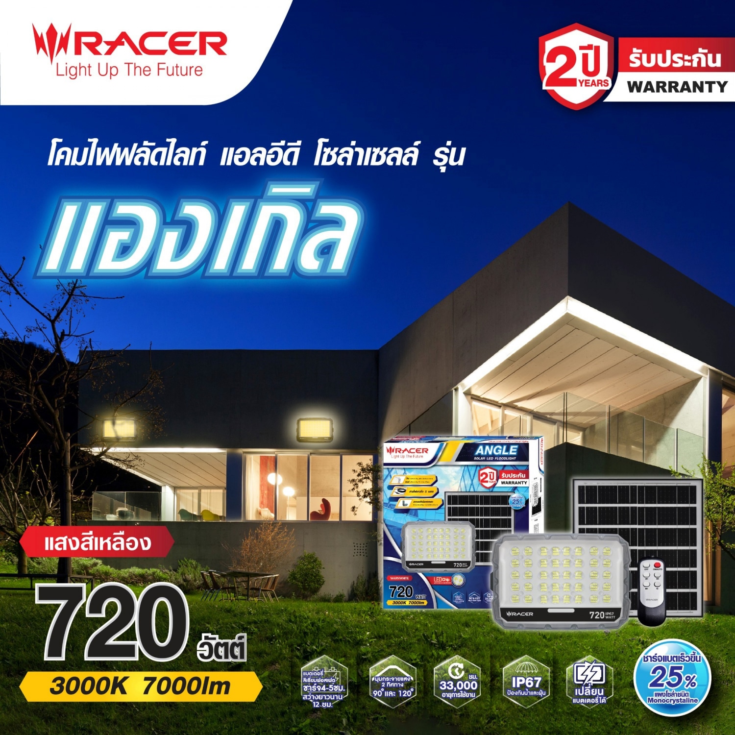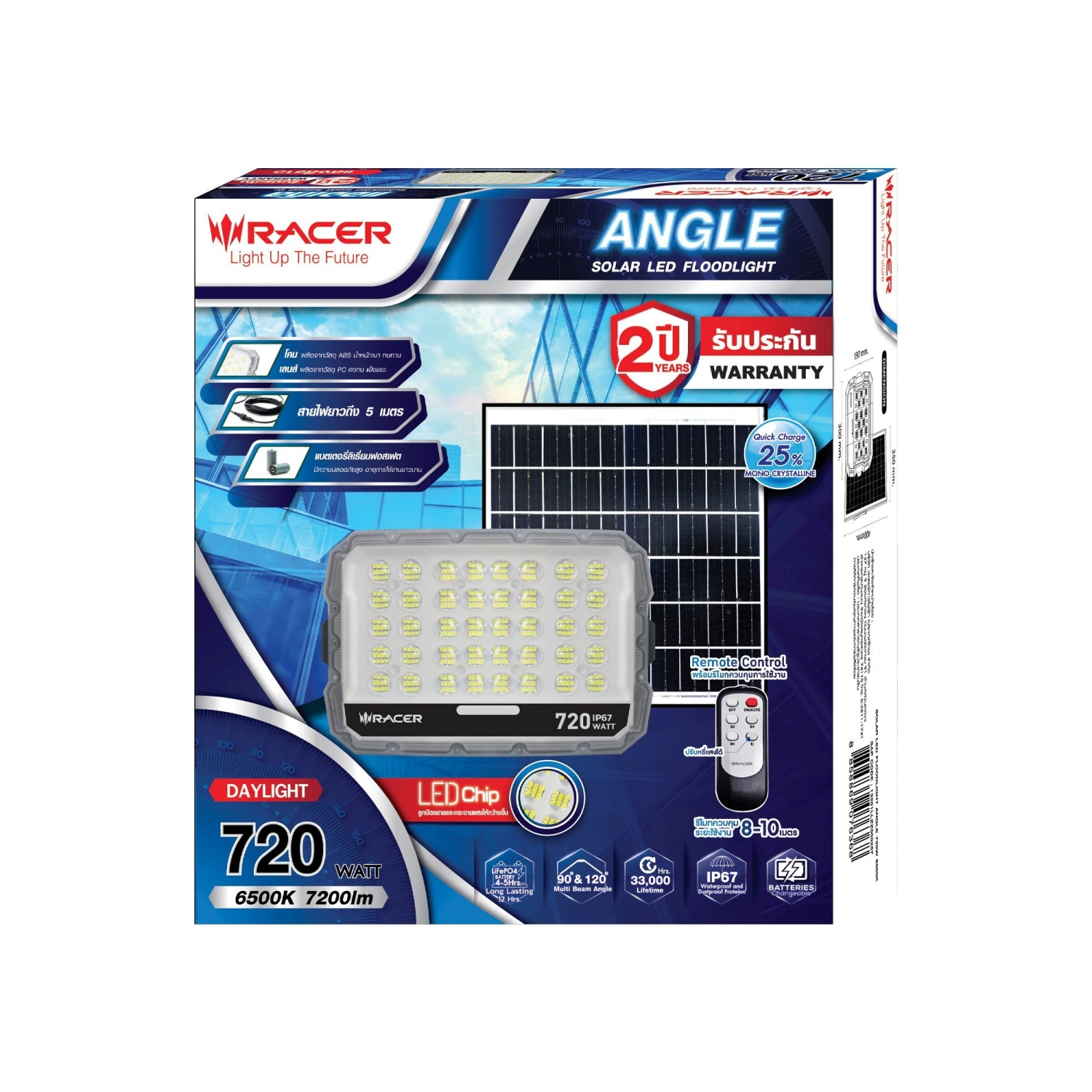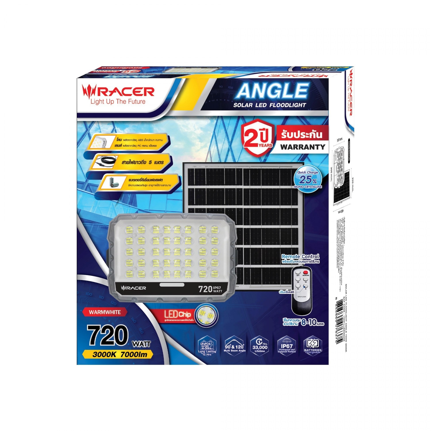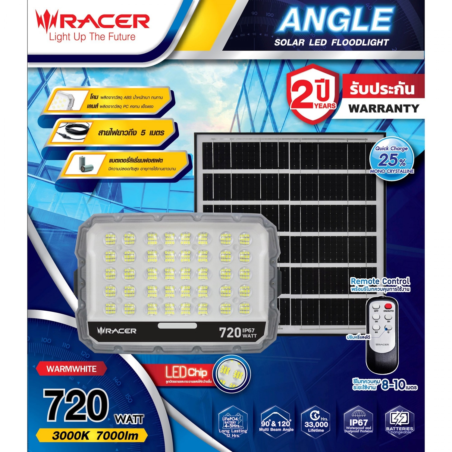 ให้แสงสว่างได้ทั้งภายในและภายนอกอาคาร , สำรองไฟได้นานถึง 12 ชั่วโมง (ที่สถานะชาร์จแบตเต็ม) สามารถปรับเปลี่ยนรูปแบบการทำงานต่างๆได้ด้วย รีโมทคอนโทรล