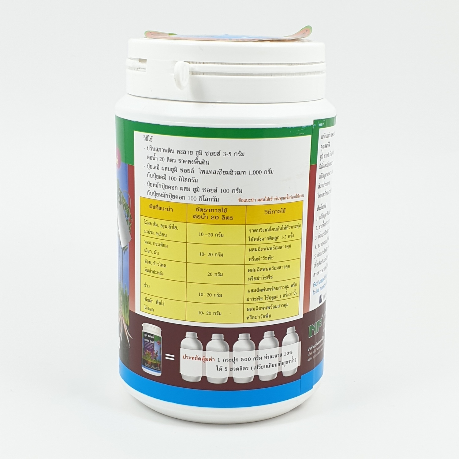 สัดส่วนการใช้ ฮูมิ ซอยล์ 10-20 กรัม (2-4ช้อนชา) ละลายกับน้ำ 20ลิตร