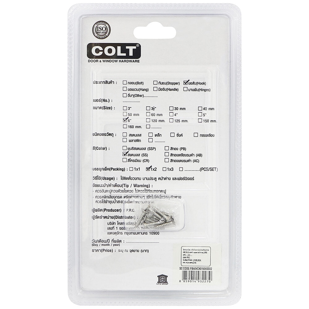 | รุ่น | ขอสับ COLT LITE #016 6 SS (2อัน/แผง) |