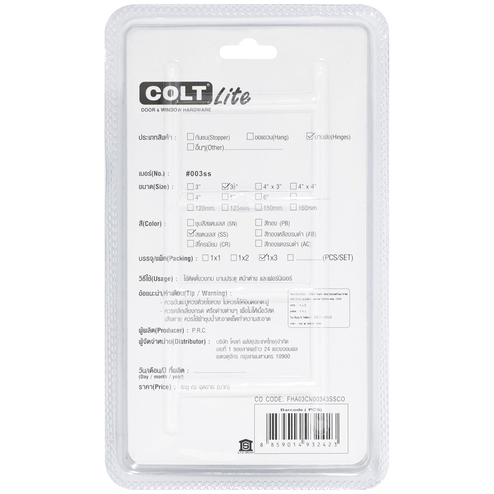 | รุ่น | บานพับสเเตนเลส COLT LITE #003 SS 3.1/2x2.1/4 หนา 1.5mm. 3ชิ้น/แพ็ค |