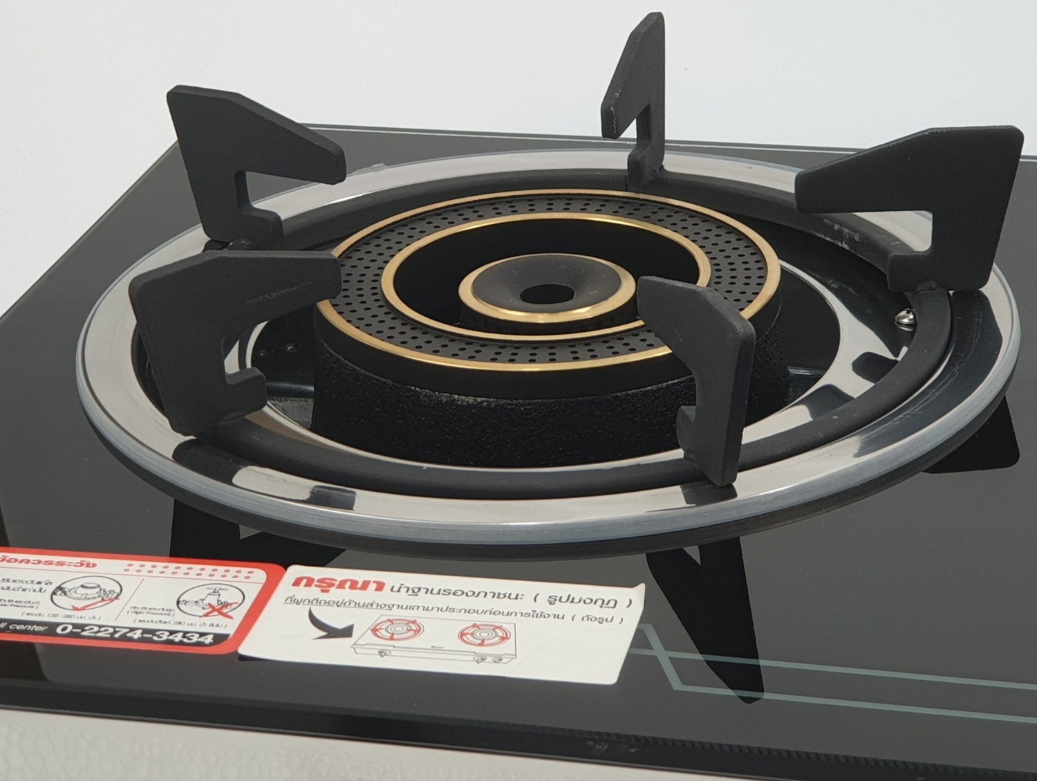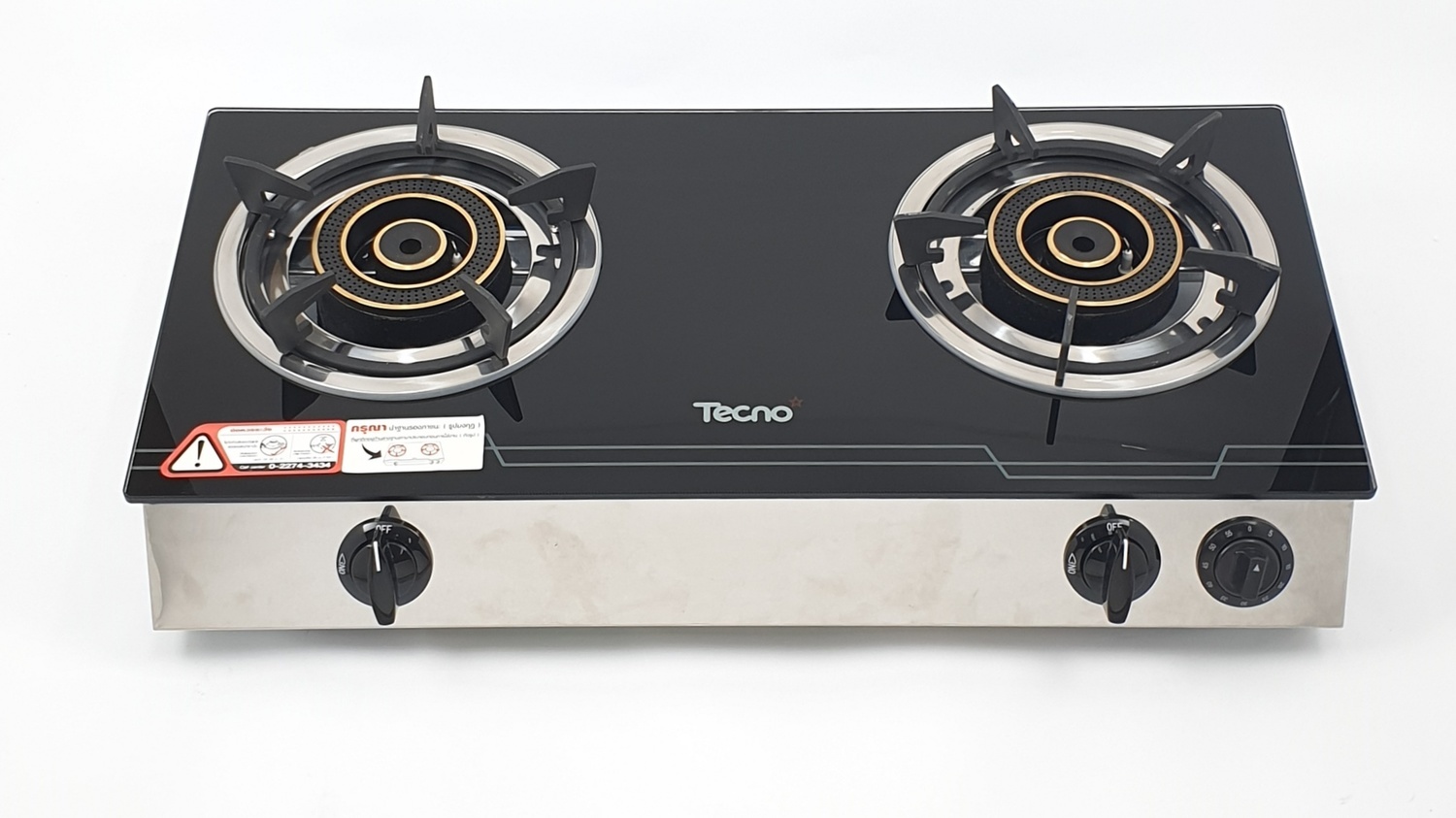 เตาแก๊ส 2 หัวเตา แบบตั้งโต๊ะขนาด 71 ซม. โครงสร้าง กระจกนิรภัยสีดำ ฐานรองภาชนะเหล็กหล่อ หัวเตา ทองเหลือง เปลวไฟ 2 ชั้น กำลังไฟ 4,300 วัตต์(x2) เลือกปรับระดับความร้อนวงใน-วงนอกได้ หรือใช้งานพร้อมกันทั้ง2วง ระบบจุดติดด้วยแมกนิโต ระบบผสมอากาศด้านบน ชนิดแก๊ส LPG แรงดันต่ำ