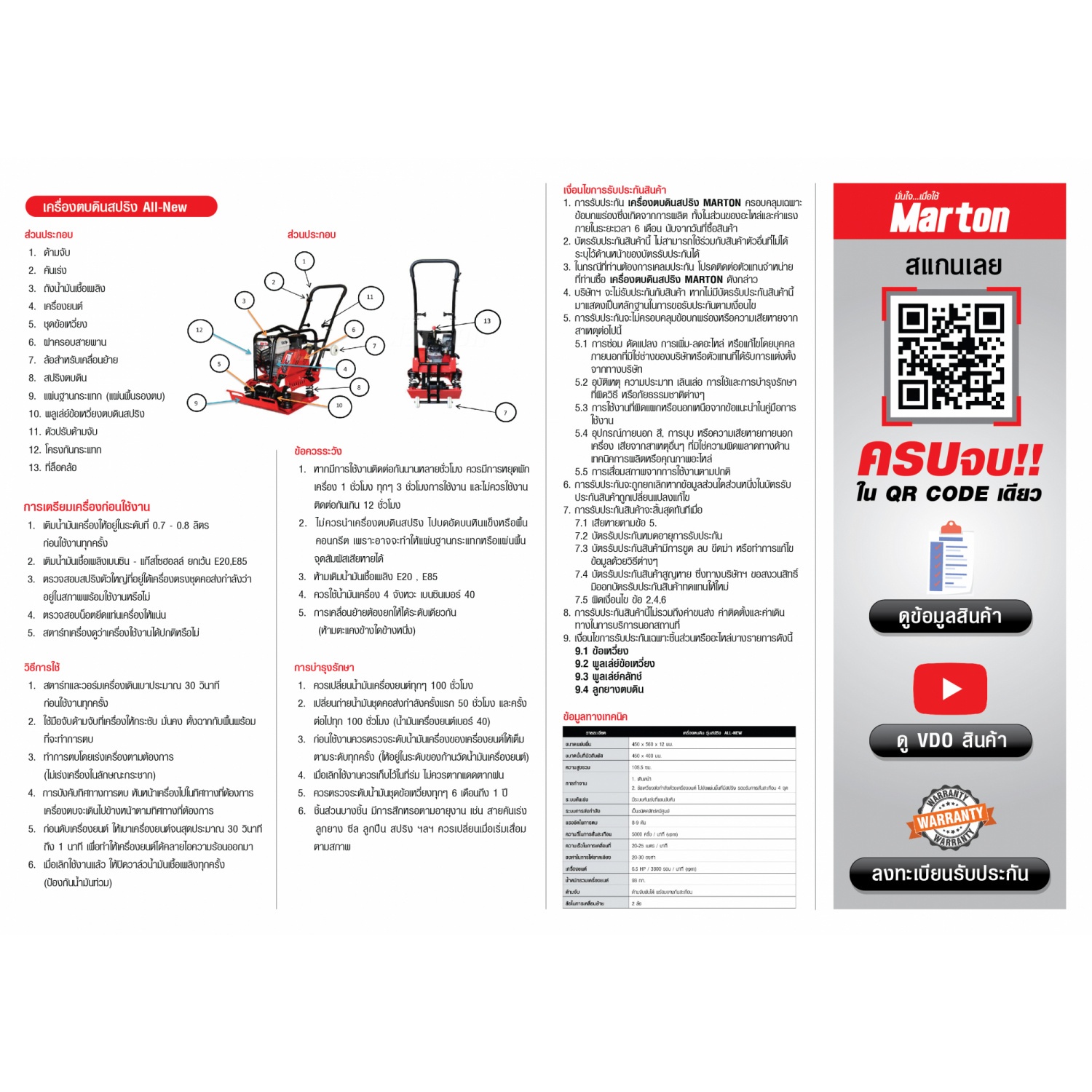 การรับประกัน : รับประกันสินค้า 6 เดือน (ตามเงื่อนไขหลังใบรับประกันMARTON)