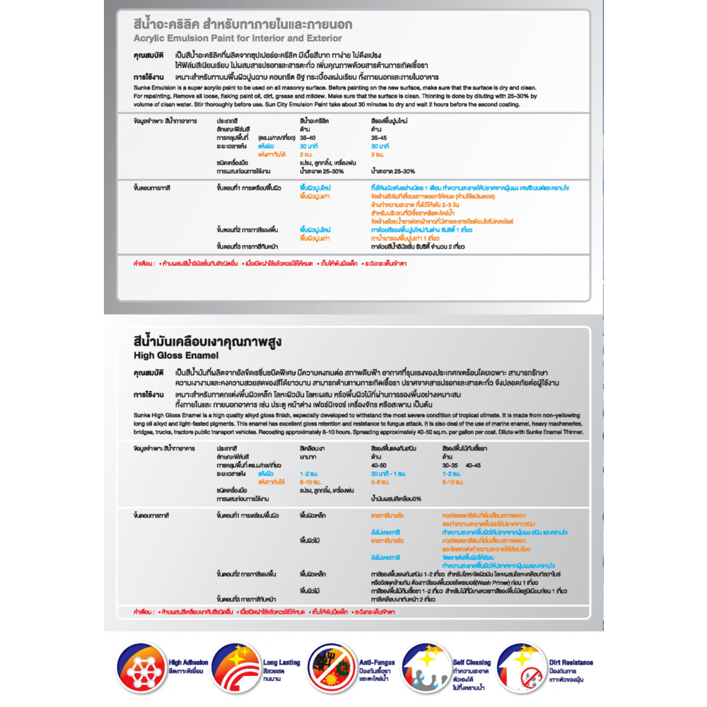 พื้นผิวต้องแห้งสนิท ปราศจากคราบไขมัน หรือสิ่งสกปรกต่างๆ สีเก่าที่หลุดล่อน ถ้ามีต้องขจัดออกให้หมด แล้วรองพื้นด้วยสีรองพื้นปูนใหม่ OEM 1 เที่ยวหลังจากนั้นให้ทาทับหน้าด้วยสีทับหน้าอะคริลิคภายนอกหรือภายใน SUNKE 2 เที่ยว