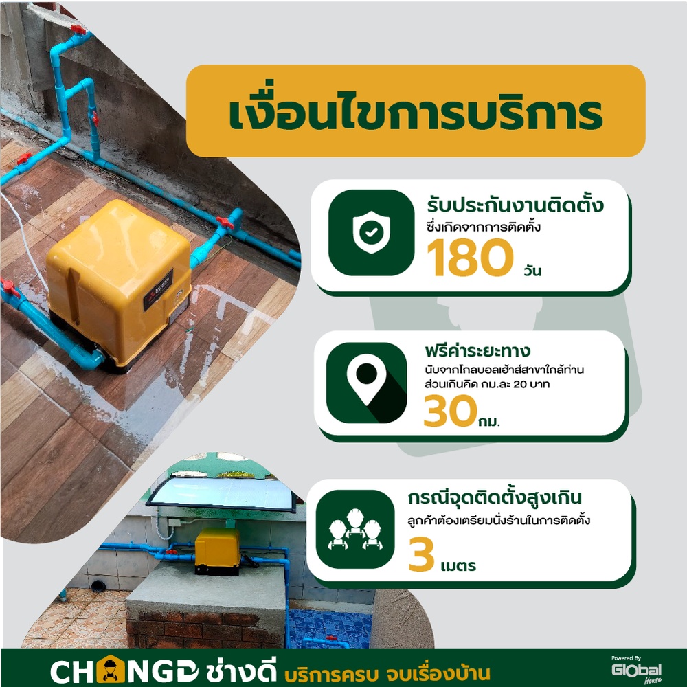 1. บริการครอบคุมการเปลี่ยนปั้มน้ำ หรือถังน้ำ กับระบบน้ำ-ระบบไฟที่ลูกค้าเตรียมไว้ ไม่ครอบคุมการเดินระบบน้ำ-ระบบไฟ กรณีหน้างานต้องเดินระบบน้ำ-ระบบไฟ จะต้องมีค่าใช้จ่ายเพิ่มเติม