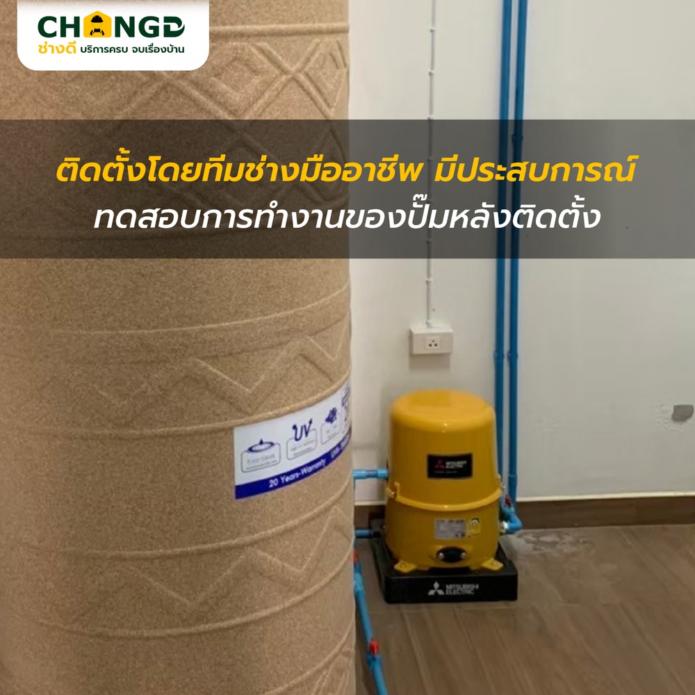 2. การติดตั้งไม่รวมการเดินท่อน้ำระบบประปาทั้งหมด จะเป็นการจัดการทางเดินน้ำระหว่างถังน้ำและปั๊มน้ำเท่านั้น