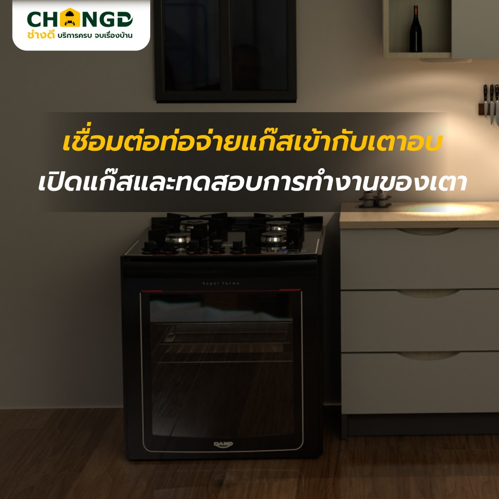ติดตั้งเตาอบแก๊ส ชนิดตั้งพื้น เชื่อมต่อท่อจ่ายแก๊สเข้ากับเตาอบ และทดสอบการทำงานของเตาเชื่อมต่อท่อจ่ายแก๊สเข้ากับเตาอบ