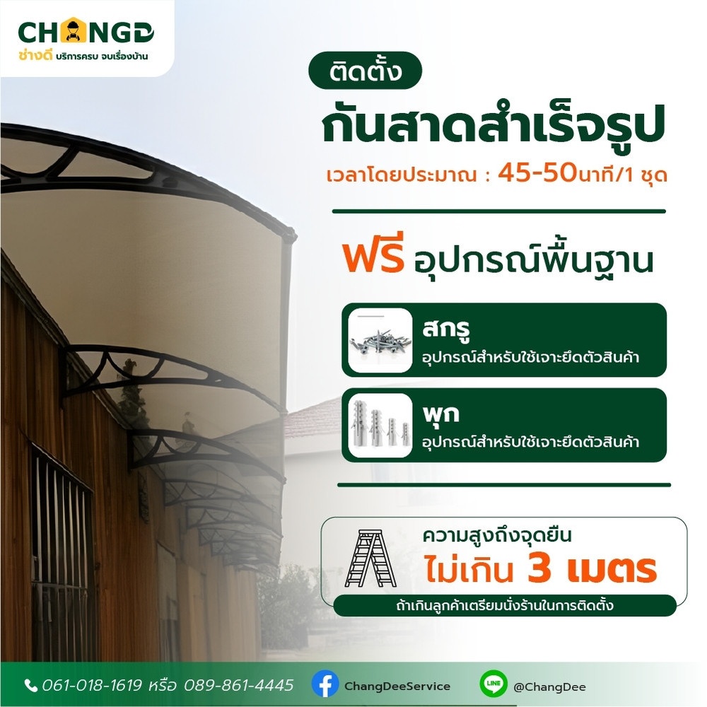 - ลูกค้าเตรียม สินค้า : ชุดกันสาด วัสดุเก็บรอยต่อกันสาดกับผนัง เช่น โพลีซีล, โพลียูรีเทน จำนวน 1 หลอด ต่อ กันสาด 2 ชุด (ไม่คิดค่าแรง)