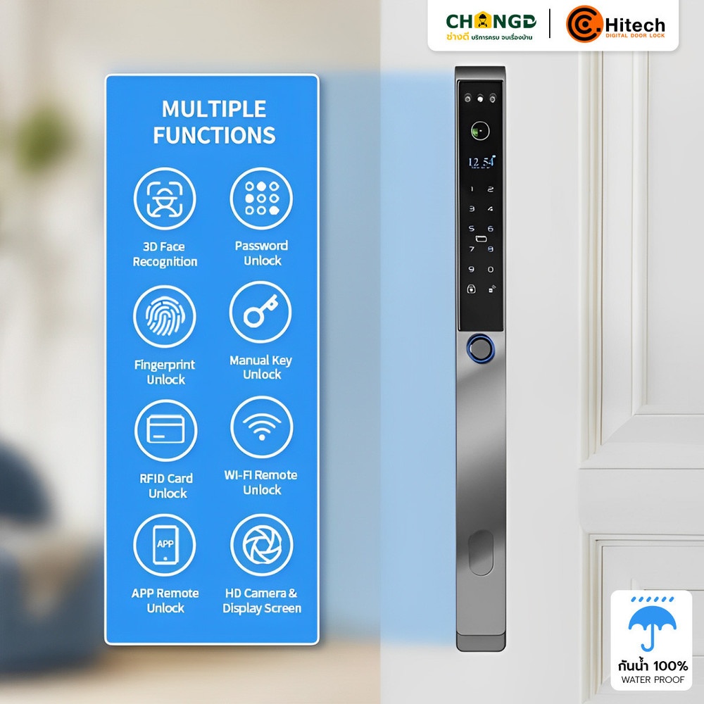 พร้อมตอบโจทย์การใช้งานของบ้านยุคใหม่ได้เป็นอย่างดี ด้วยกลอนดิจิตอล C.HITECH คุณสมบัติป้องกันน้ำและกันความชื้นรอบทิศทาง ให้คุณใช้งานได้อย่างมั่นใจในทุกสภาพอากาศ ด้วยฟังก์ชันการปลดล็อก 7 รูปแบบ ไม่ว่าจะเป็นการปลดล็อกผ่านแอปพลิเคชัน, สแกนเส้นเลือดมือ, สแกนใบหน้า, สแกนลายนิ้วมือ, ตั้งรหัสตัวเลข, ใช้บัตรผ่าน หรือใช้กุญแจ เพิ่มความสะดวกให้กับผู้ใช้ในหลายช่วงอายุ อีกทั้งยังมีกล้องตาแมว ที่ให้คุณสามารถดูภาพบุคคลที่มาเยี่ยมเยือนผ่านหน้าจอ ช่วยเสริมความมั่นใจและปลอดภัยอีกขั้นให้กับคุณ